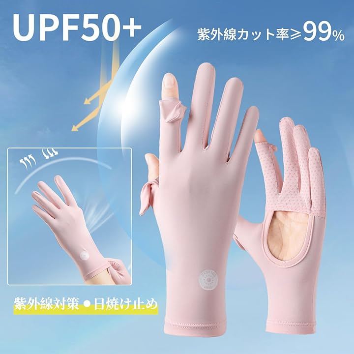 「UPF50+。紫外線99%カットの本格UV対策手袋」UPF50+の生地を採用し、紫外線カット率99%を実現、接触冷感効果で装着瞬間からひんやり快適。