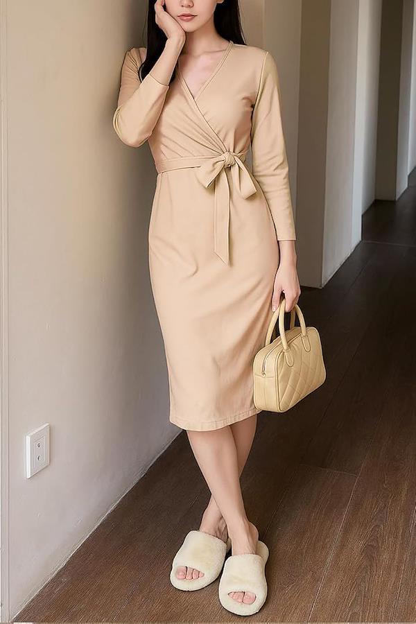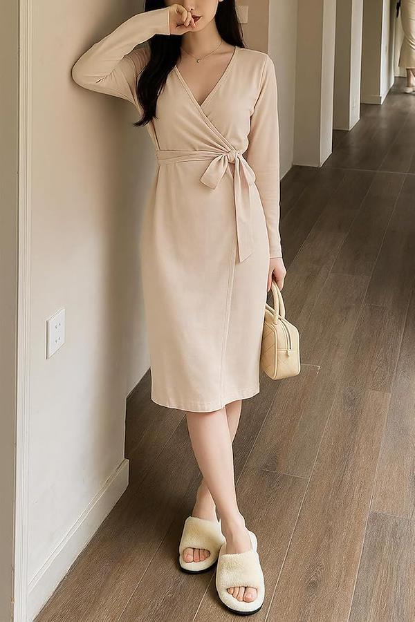 「セクシーな膝丈ワンピース」上品さと色気を兼ね備えた大人の女性にぴったりの Vネック カシュクール ワンピース です。
