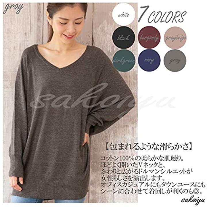 コットン100%の柔らかな肌触りで着心地・程よく開いたVネックと、ふわりと広がるドルマン・シルエットが、リラックス感がありながらもフェミニンな女性らしく、春ニットとしても活躍します。