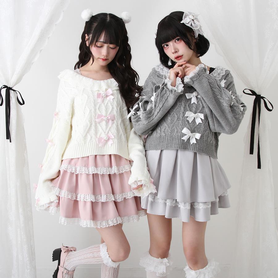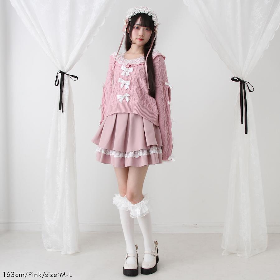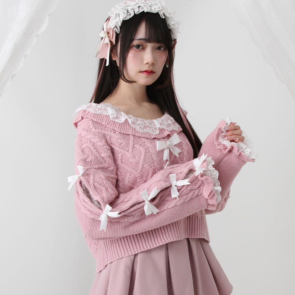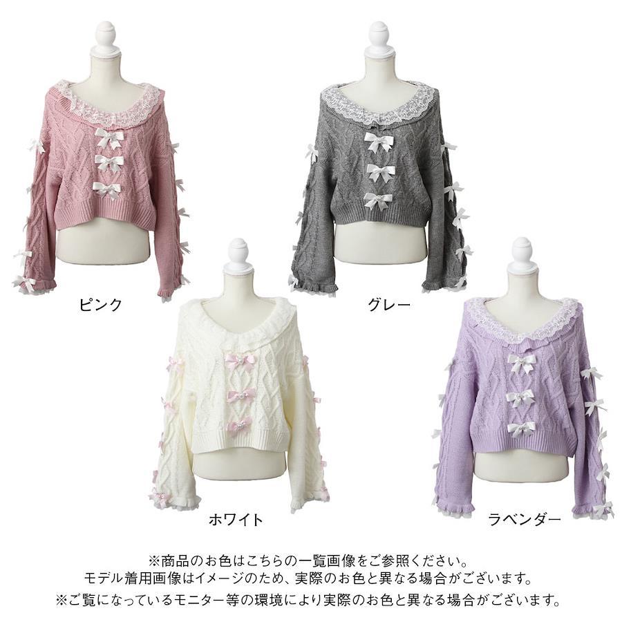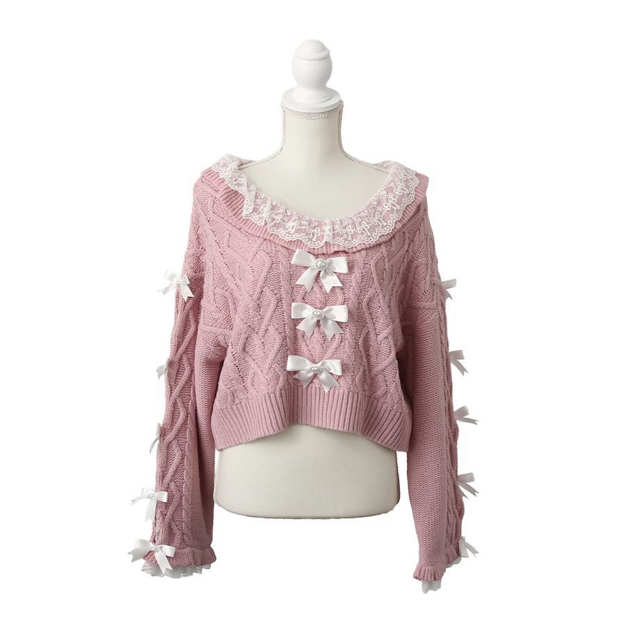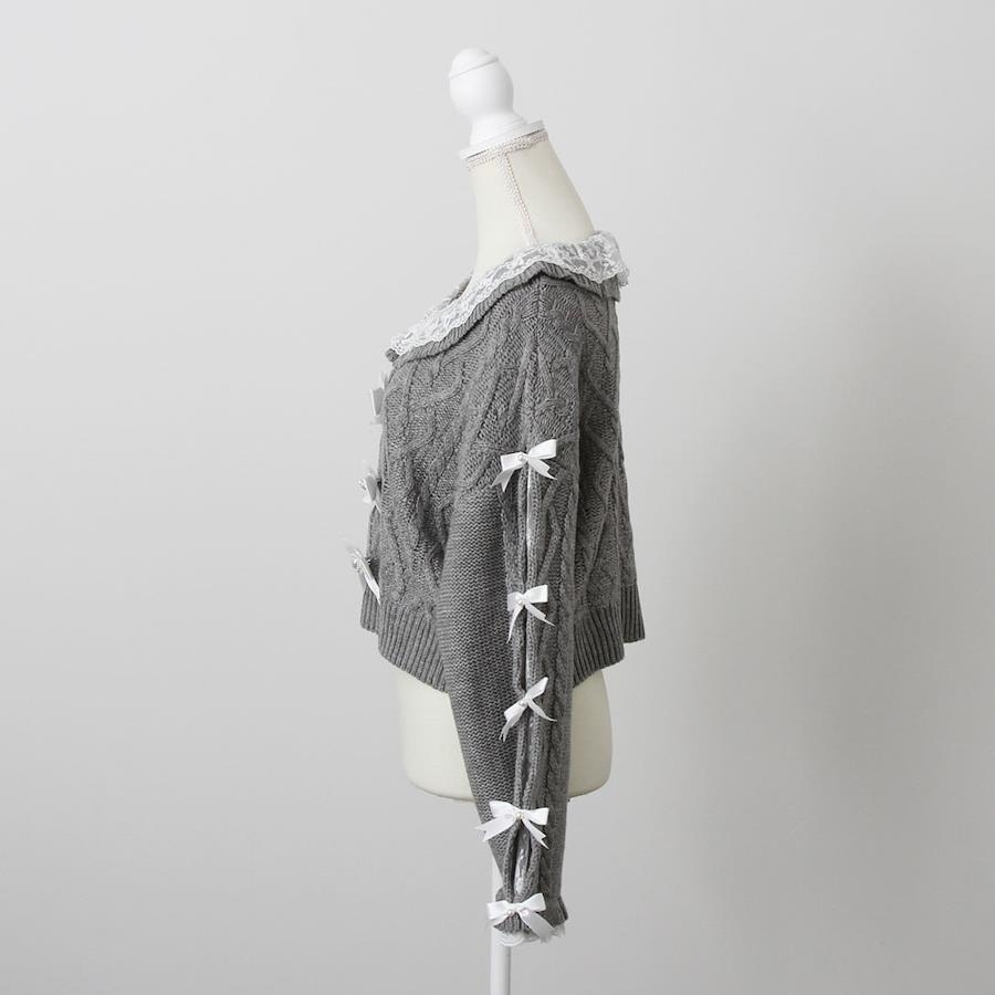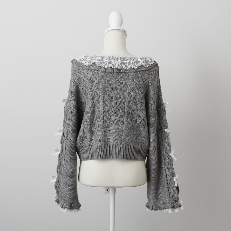 Vネックリボンレースビジューハートケーブルニットトップス