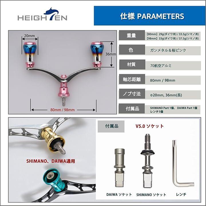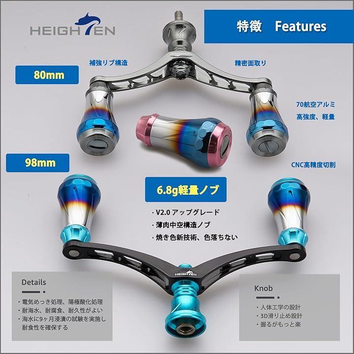 「サイズ」ハンドル軸心距離98mm、V2.0新型ノブ直径20mm 「総重V4.0-98mm」33g(ダイワ用) / 37.5g(シマノ用)「総重V4.0-80mm」29g(ダイワ用) / 33.5g(シマノ用)「総重V3.0-98mm」39g(ダイワ用) / 44.5g(シマノ用)「素材」航空アルミ。