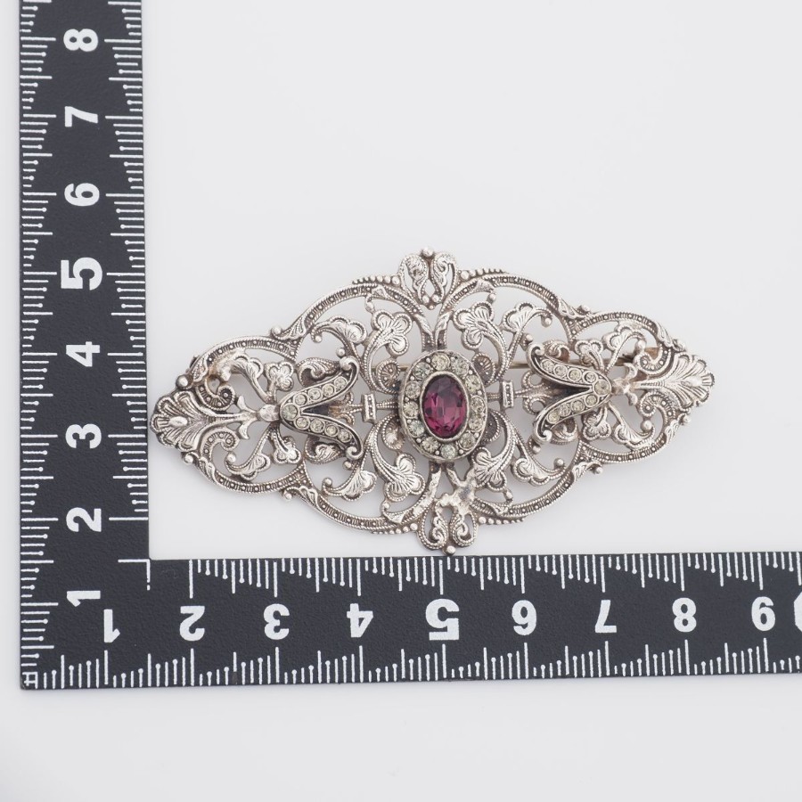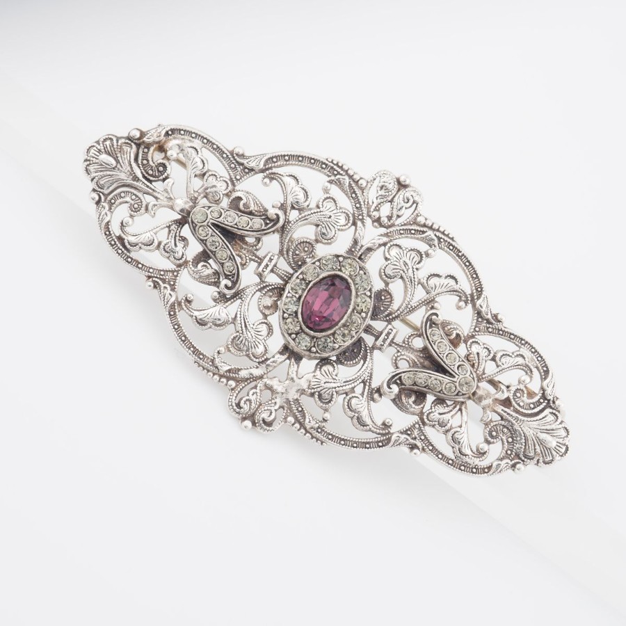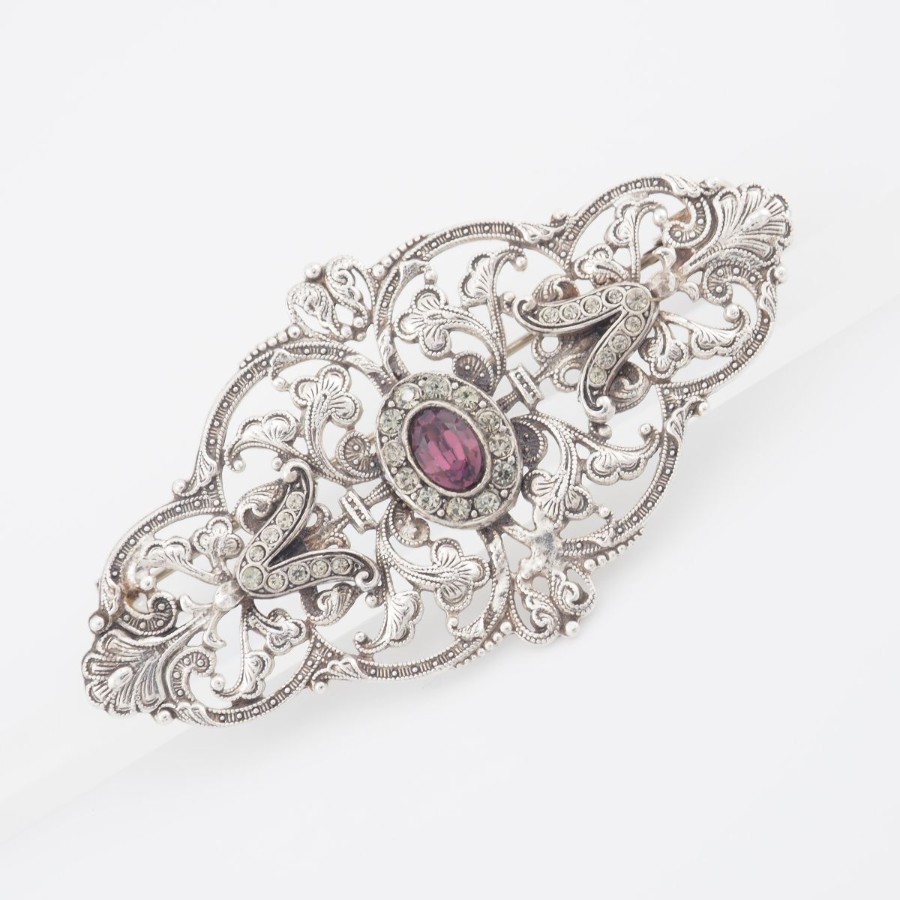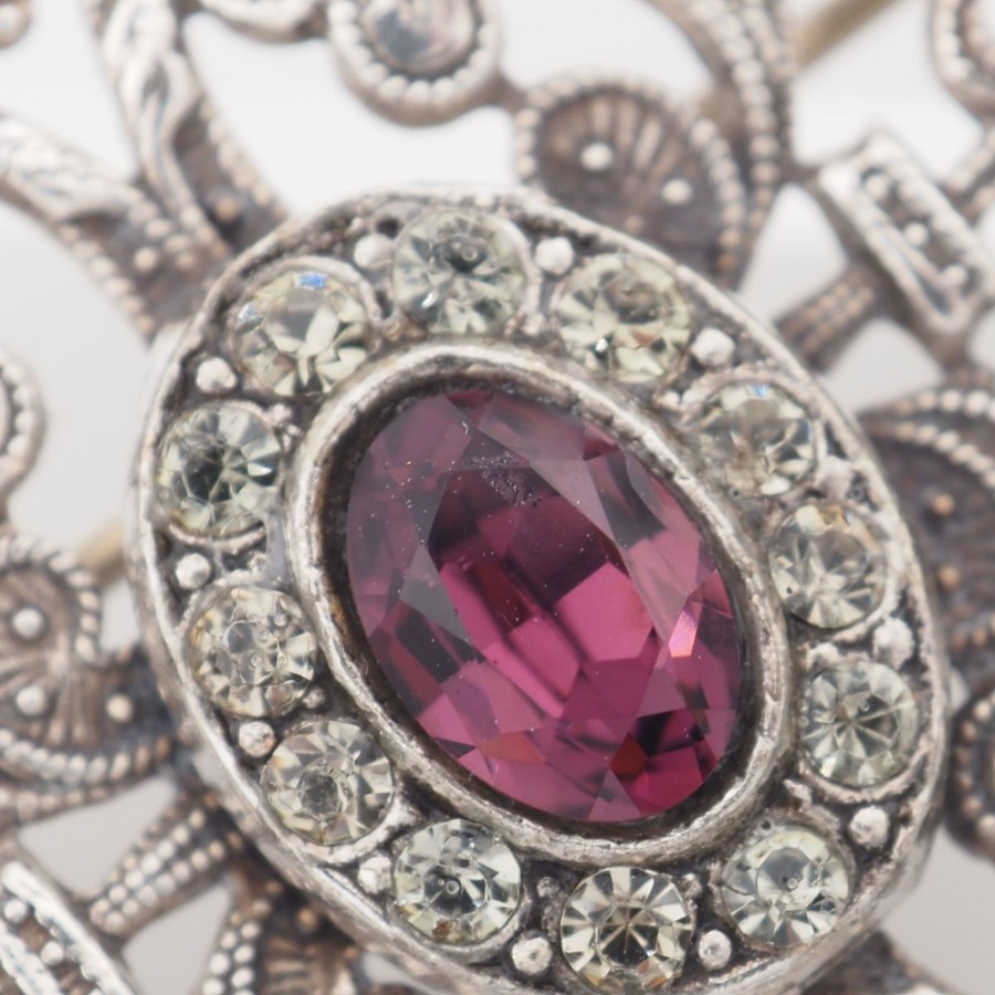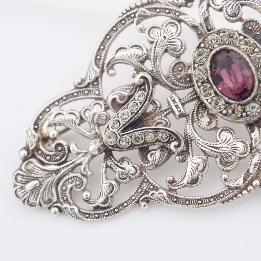 V532 Amethyst-like Diamond-like Brooch, Openwork Design, Silver Color, Vintage