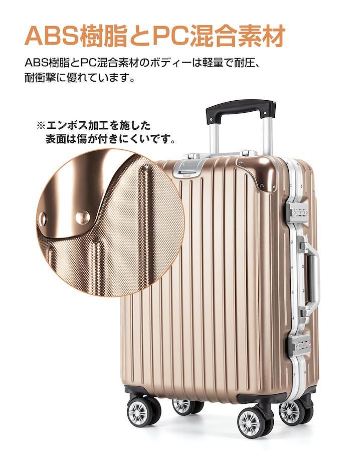 【改良されたアルミフレーム&ボディー素材】スーツケースは強化アルミフレームを採用し、従来のファスナータイプに比べ、高級感があって頑丈です。また、スーツケース本体の形状維持を強化させ、耐衝撃性と耐久性を向上させます。ボディーはABS樹脂とPCの混合素材で作られ、耐衝撃性に優れています。エンボス加工を施し、傷つきにくいです。 【TSAダイヤル式ロック】TSAダイヤル式ロックが搭載され、外出がより安全。また、ロックについている鍵穴は航空会社検査専用の物です。本製品に鍵は付属しておりません。【永久品質保証】商品をご使用中に何か問題がある場合、弊社にお気軽にお問い合わせください。迅速に対応させていただきます。 【高さ調節可能なキャリバー&隠しフック】超軽量のアルミニウム製キャリバーの高さは調節可能で、ご自分の身長に合わせて適切な高さまで調整できます。耐振性に優れるデザインで安定してスーツケースを引いて歩けます。隠しフック付きで手荷物を掛けて気楽に移動でき、旅行中の手への負担を軽減します。 【耐衝撃静音ダブルキャスター】高弾性TPE衝撃軽減素材のキャスターを採用し、より静かで耐摩耗性も向上しています。スムーズな滑りを実現しながら、360度の自由回転もできます。コーナーにコーナーパッドを追加し、耐衝撃性に優れ、より長くご利用いただけます。 【合理的な内装】高品質なポリエステル生地を採用し、ファスナー開閉式のU型仕切りは荷崩れ防止だけでなくプライバシー保護効果もあります。メッシュポケット付きで小物などのお荷物が分かりやすく、一目瞭然。濡れものの収納ができる乾湿分離ポケットが便利です。クロスベルトも完備され、荷物崩れを完全防止。