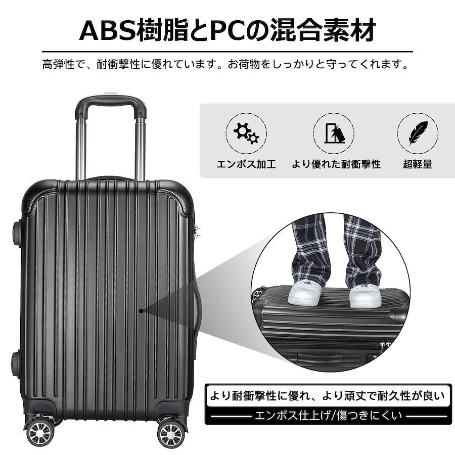 【材質&TSAダイヤル式ロック】スーツケースはABS樹脂とPCでの混合素材で作られ、耐衝撃性に優れた上、高弾性で、変形しにくい。エンボス加工、傷つきにくい。アルミフレームスーツケースより軽量で持ち歩きやすい。TSAダイヤル式ロックが搭載されて、外出がより安全。また、鍵穴は航空会社検査専用の物です。本製品に鍵は付属しておりません。 【三段調節キャリバー&柔軟ハンドル】超軽量のアルミニウム製キャリバー、高さ三段階調節、ご自分の身長に合わせてスムーズに調整が可能です。耐振性に優れるデザインで荷物を引きかける時、しっかりしています。また、滑りにくいソフトハンドルで長い時間の手提げでも手は疲れません。 【耐衝撃静音ダブルキャスター】高弾性TPE衝撃軽減素材のキャスターを採用し、より静かで耐摩耗性も向上しています。スムーズな滑りを実現しながら、360度の自由回転もできます。ダブルキャスターデザイン、旅先での移動をよりリラックスで快適になります。角部に硬質コーナープロテクトを追加、衝撃を効率的に吸収でき、より長くご利用いただけます。 【合理的な仕切りデザイン】高品質のポリエステル生地で、柔らかいかつ快適です。密閉されたU字型コンパートメントは荷崩れ防止だけでなくプライバシー保護効果もあります。メッシュポケットにより、収納しにくい小物でもは一目でわかります。X型ベルトが完備され、荷物崩れを完全防止。収納力抜群、たくさんの小物を入れることはできます。 【安心アフターサービス】製品に初期不良または使用中に何が問題がある場合は弊社にご連絡くださいませ。誠心誠意対応させていただきます。
