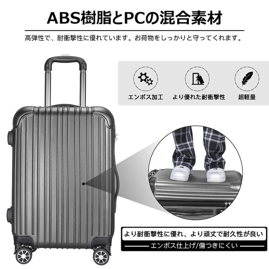 【材質&TSAダイヤル式ロック】スーツケースはABS樹脂とPCでの混合素材で作られ、耐衝撃性に優れた上、高弾性で、変形しにくい。エンボス加工、傷つきにくい。アルミフレームスーツケースより軽量で持ち歩きやすい。TSAダイヤル式ロックが搭載されて、外出がより安全。また、鍵穴は航空会社検査専用の物です。本製品に鍵は付属しておりません。