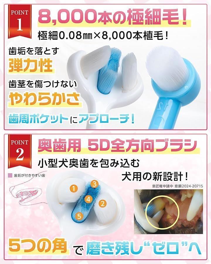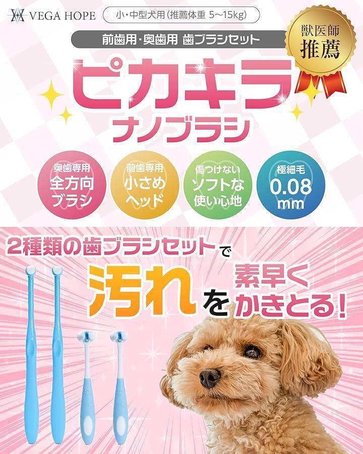 そこで、ペットのワンちゃんの為の前歯用・奥歯用歯磨きセット「 ピカキラナノ ブラシ小型犬、中型犬用」が誕生しました。
