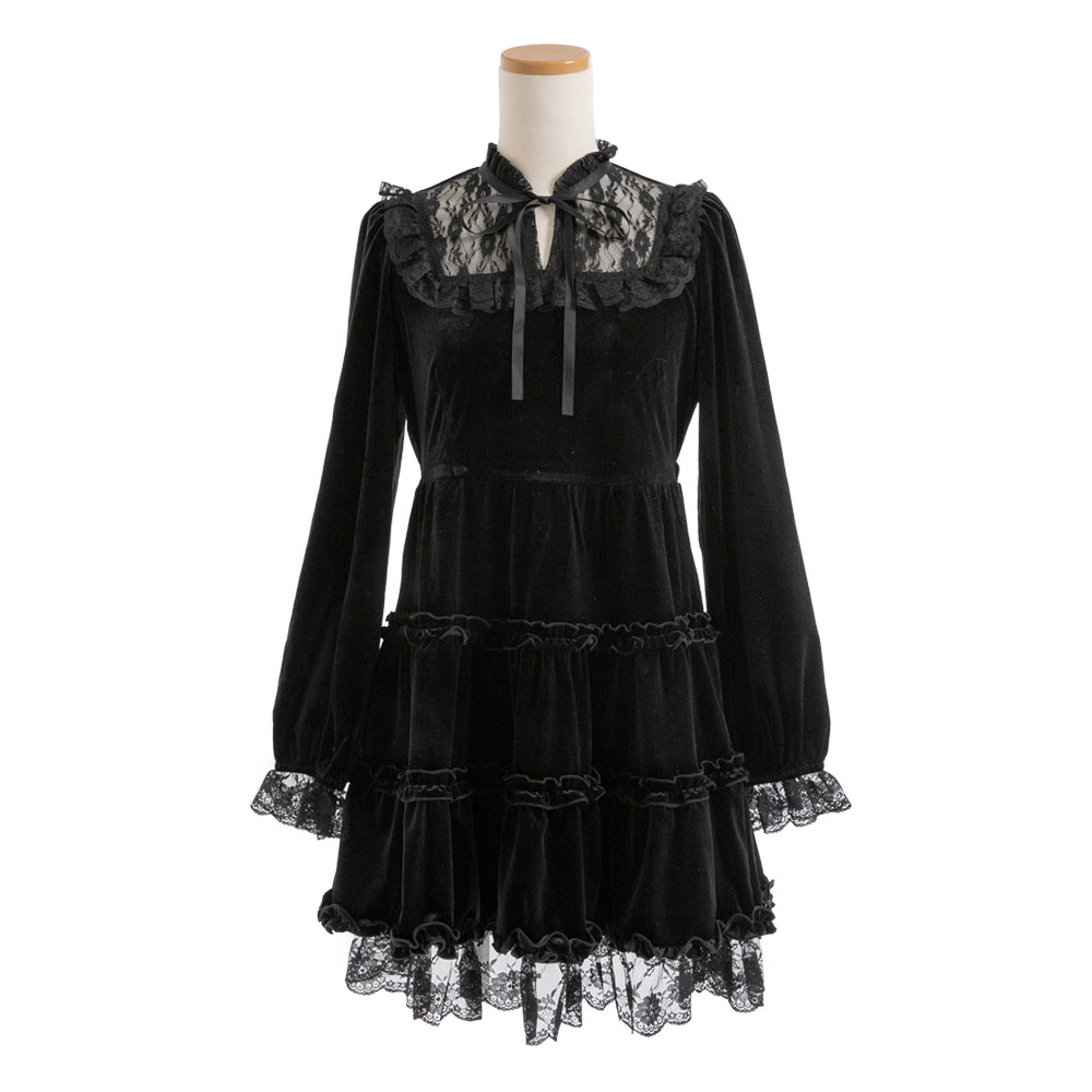 シーズンムード高まるベロア生地が高見えして、ヨークのレースやフリルが上品でクラシカルなデザイン。