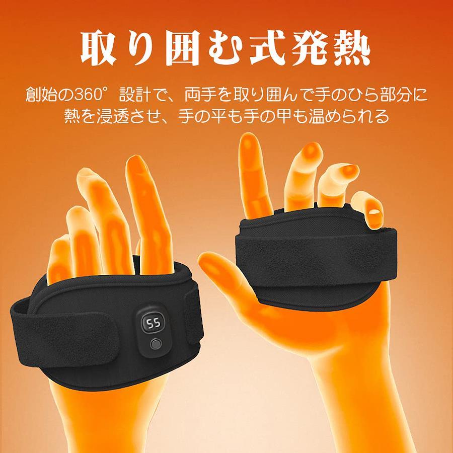 3営業日以内に発送≪新品未開封品≫:【ヒーター付き&3段階温度調節】電熱手袋や電気カイロの利点と合わせて、つける式充電式カイロが登場しました。最新版の発熱センサーが手のひらの部分に搭載し、僅か3秒ですばやく予熱することができます。その上、三階段温度調節機能(45、50、55℃)を備え付けて、異なる場所により対応の温度に切り替えが可能です。【USB充電式&最大8時間連続使用可能】3000mAh大容量電池を内蔵し、一回充電で最大8時間まで連続使用可能で、しかも専門のUSBケーブルを備え付けるので、急速に電力を満たすことができます。使い捨てカイロとは異なり、繰り返す利用できるカイロです。【男女兼用&多場合大活躍】ほとんどの手にフィットするフリーサイズ。指切りタイプで指が自由に動作できてスマホの操作やキーボードタイピング、お財布からお金を取るなど細かな作業などいちいち手袋を脱がなくてもOK!手袋の下のインナーとして利用することも可能です。 お部屋でのパソコン仕事の時はもちろん、スポーツやアウトドア、車の運転にもお勧め!【LEDライト付き&多用途】おしゃれな見た目はいつも本製品の一つ優勢です。この上、手袋のような充電式カイロ