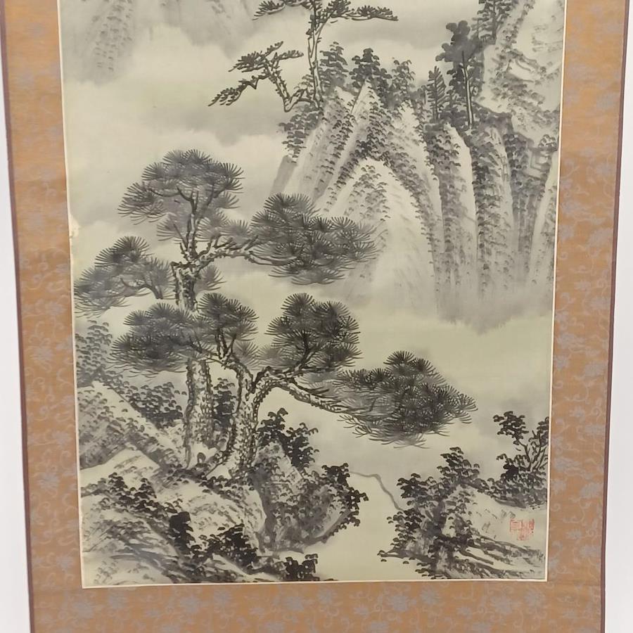 This is a beautiful used Japanese hanging scroll, known as a "Kakemono." It features the elegant and powerful calligraphy of "Kouzan Unei," which can be translated as "shadow of the clouds on a high mountain." This art form focuses on the spirit and flow of the artist. The subtle use of ink and brushwork gives this artwork a meditative and serene quality.