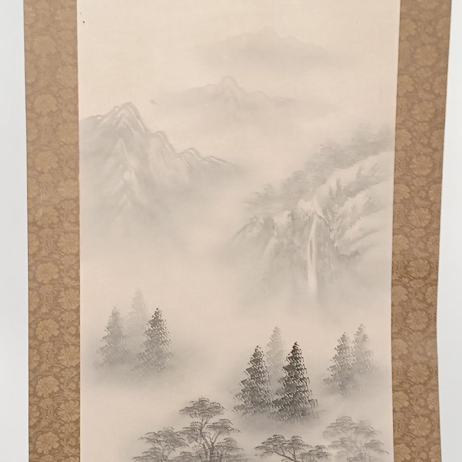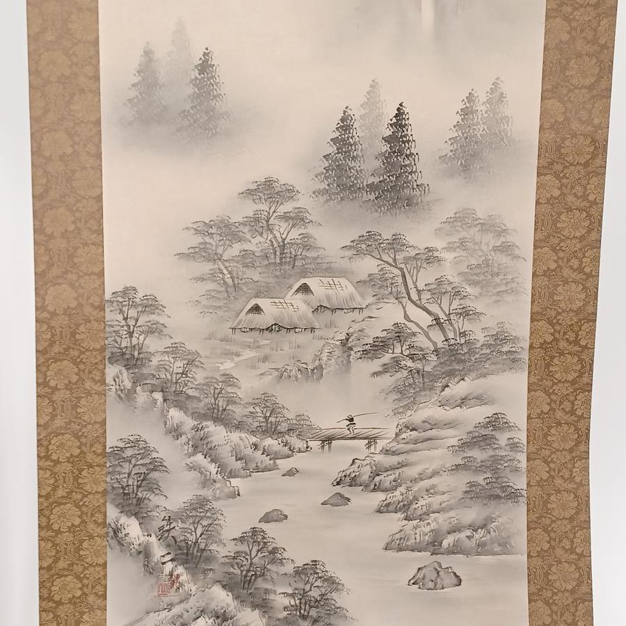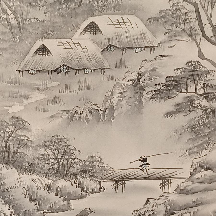 This is a beautiful used Japanese hanging scroll, known as a "Kakemono." It features a serene Sumi-e (ink wash) painting of a traditional Japanese landscape, signed by the artist Tetsuji. This piece embodies the simple elegance and deep spiritual beauty of Japanese ink art.