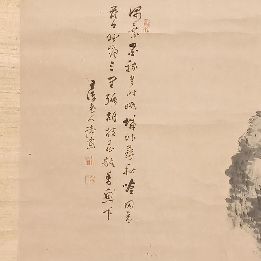 This is a beautiful used Japanese hanging scroll, known as a "Kakemono." It features a serene ink painting of a forest and mountains, created with a traditional Japanese Sumi-e technique. The subtle use of ink and brushwork captures the tranquil beauty and peaceful harmony of a Japanese landscape.