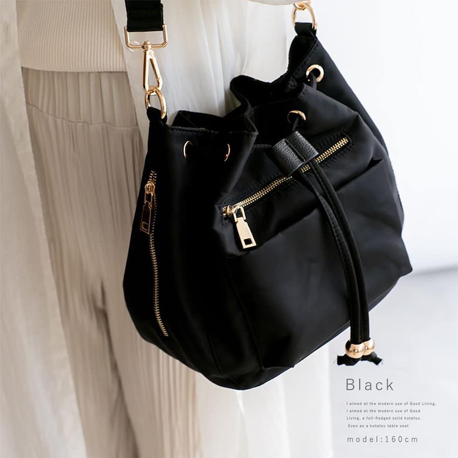 ショルダーバッグ 巾着バッグ レディース 小さめ ナイロン 10ポケット 斜めがけ 肩掛け 軽い 軽量 マチ広 大容量 多収納 おしゃれ 通勤 ミニバッグ トレンド かわいい おしゃれ 身軽 プチプラ 安い 人気 シンプル 夏バッグ 秋バッグ vnsb-698z10ポケットで整理整頓が叶う巾着ショルダーバッグ。 コロンとした可愛らしいフォルムながら、光沢のある軽量ナイロン素材で上品な印象に。 巾着部分は大きく開くので中身が取り出しやすく、マグネット付きで開閉も安心。 長さ調節可能なショルダーベルトで、肩掛け・斜めがけも可能。 細々した荷物が多い方や、多収納バッグをお探しの方にピッタリです。■サイズ等 ●SIZE:高さ:約28cm / 幅:約18cm(閉じた時)約37cm(開いた時) / マチ:約13.5cm ●ショルダーベルト長さ:約63.5~121cm×幅:約3cm(取り外し可能/調節可) ●ショルダーベルト高さ:約36.8~68cm ●外ポケット:前面ファスナー付きポケット2、背面ファスナー付きポケット1、サイドファスナー付きポケット2 ●内ポケット:オープンポケット3、ファスナー付きポケット2 ●ショルダーベルト重量:約84g ●バッグのみ重量:約348g ●素材:ナイロン ●バッグのメイン開閉口はマグネット&巾着になっております。