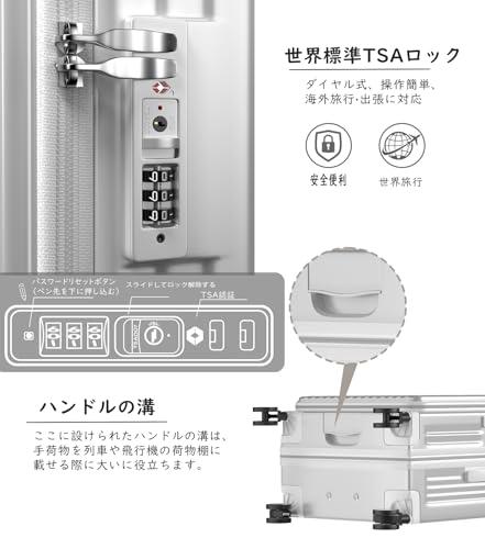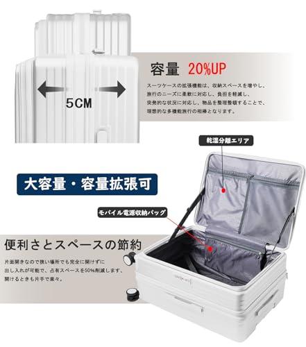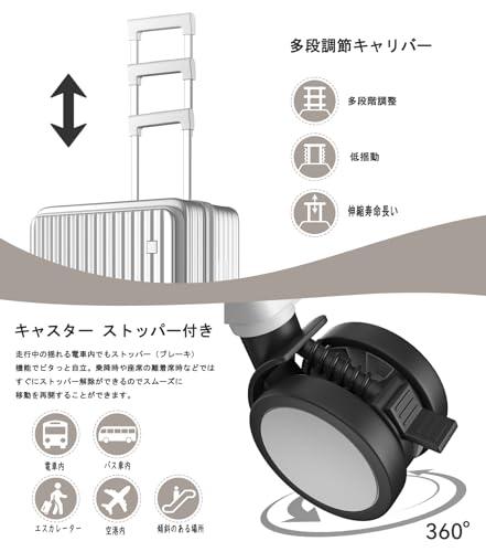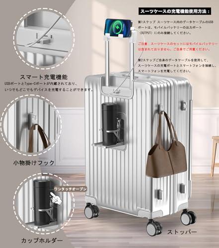 【片開き・拡張可能・大容量タイプ】片面開きなので狭い場所でも完全に開けずに出し入れが可能で、占有スペースを50%削減します、開けるときも片手で楽々。ファスナータイプで、マチ幅を5cm拡張するだけで容量が20%UPできる。旅先でお土産が増えても安心です。※拡張時は機内持ち込み不可 【多機能・キャスター ストッパー付き ・USB+Type C充電ポート付き ・カップホルダーとスマホルダーを付く】走行中の揺れる電車内でもストッパー(ブレーキ)機能でピタっと自立。乗降時や座席の離着席時などではすぐにストッパー解除ができるのでスムーズに移動を再開することができます。スーツケースにモバイルバッテリーを収納するポケットがついており、 USB+Type Cポートの充電口が外にあることで、いつでもどこでも充電できます。便利な折りたたみ式ドリンクホルダー付き。バックカップホルダー、ミルクティーカップ、傘いつでも配置でき、旅行をより便利にすることができます。レバーの上部にはスマホルダーが付いているので、フライトの待ち時間に両手が自由になり、外出先でもリラックスできます。 【高品質なボディ&丈夫かつ軽い素材】軽さと堅固性に優れているPC (ポリカーボネート)とABS樹脂を配合したボディ。女性でも持ち上げられる軽さですが、衝撃に強く中の荷物をしっかりと守ります。 衝撃にも強く、無数に細かい凸凹が傷をつきにくくしてくれます。ケースのメンテナンスに関するヒント: 傷やへこみを避けるため、鋭利なものでスーツケースを傷つけたり、激しい摩擦や衝突を与えたりしないように注意してください。 【三段調節キャリバー・世界基準の安全性】超軽量のアルミニウム製キャリバー、高さ三段階調節、ご自分の身長に合わせてスムーズに調整が可能です。耐振性に優れるデザインで荷物を引きかける時、しっかりしています。また、滑りにくいソフトハンドルで長い時間の手提げでも手は疲れません。海外旅行には欠かせないTSAダイヤル方式のロックが搭載されており、外出がより安全になります。※鍵は航空会社検査専用のため本製品には付属しておりません。 【双輪キャスター・360度回転】静音、耐久性に優れた双輪キャスターは、自由に360度回転し、旋回時や悪路の走行も安定しています。故障率の高いシングルタイヤに比べて、安定感抜群です。高弾性TPE衝撃軽減素材のキャスターを採用し、より静かで耐摩耗性も向上しています。スムーズな滑りを実現しながら、360度の自由回転もできます。ダブルキャスターデザイン、旅先での移動をよりリラックスで快適になります 【1年間無料保証】商品到着後(30日内)、誤配送・破損・故障等の問題がございましたら、早急に出品店舗へとご連絡ください。返品、返金、交換などを承ります。30日を過ぎた製品に明らかな使用痕跡がある場合は、主に修理サービスを提供いたします。 ※画像と実物のカラーにつきまして、全品スタジオ撮影素材を使用しておりますが、お客様のデバイスやデバイスの設定によって見え方が変わる場合がありイメージと若干異なる場合もございます。