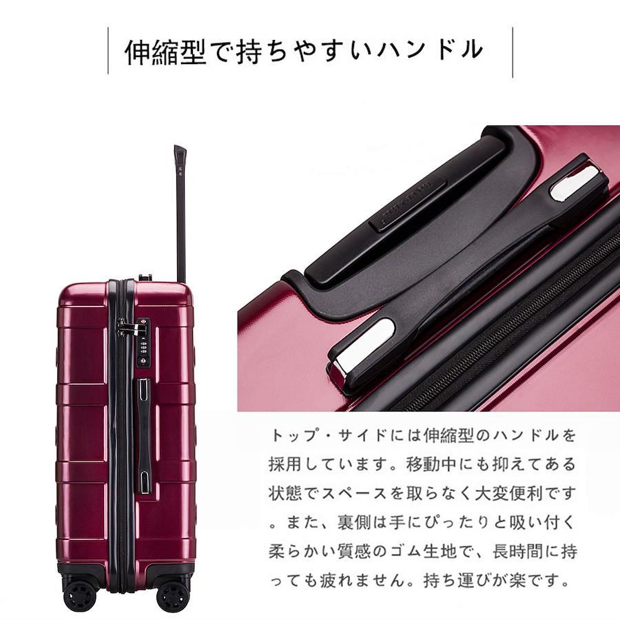 【表地】本体は耐久性に優れたPC素材を採用しています。 【軽量で耐圧力がいい】ABSより優れる素材PCを採用します,軽くて強いPCボディにキズを目立ちにくくするエンボス加工、 耐衝撃性に優れた上、高弾性で、変形しにくい 【消音設計キャスター】消音キャスターで早朝や夜間の持ち運びも安心です。ダブルキャスターは操作性のスムーズな360度回転8輪独立サインレントキャスターです。 【留め具の種類 】ファスナーで簡単操作で.内装シェル荷物露出しない密閉タイプのU字型ファスナーポケット、メッシュポケット付きの整理に便利、後シェルは固定バンド装備。 【TSAロック】世界基準のTSAロック搭載。アメリカ空港(グアム、ハワイ、サイパン含む)では必需品。信頼のTSA職員と本人しか開けることができません。※TSAロックの鍵は運輸保安庁の職員が所有する物で、本製品は付属しておりません。 【三段階調節可能なキャリーバー 】軽量かつ頑丈なアルミ製のキャリバーは、ボタンワンプッシュで身長や利用シーンに合わせて三段階調整ができます。耐振性に優れるデザインで荷物を引きかける時、しっかりしています。