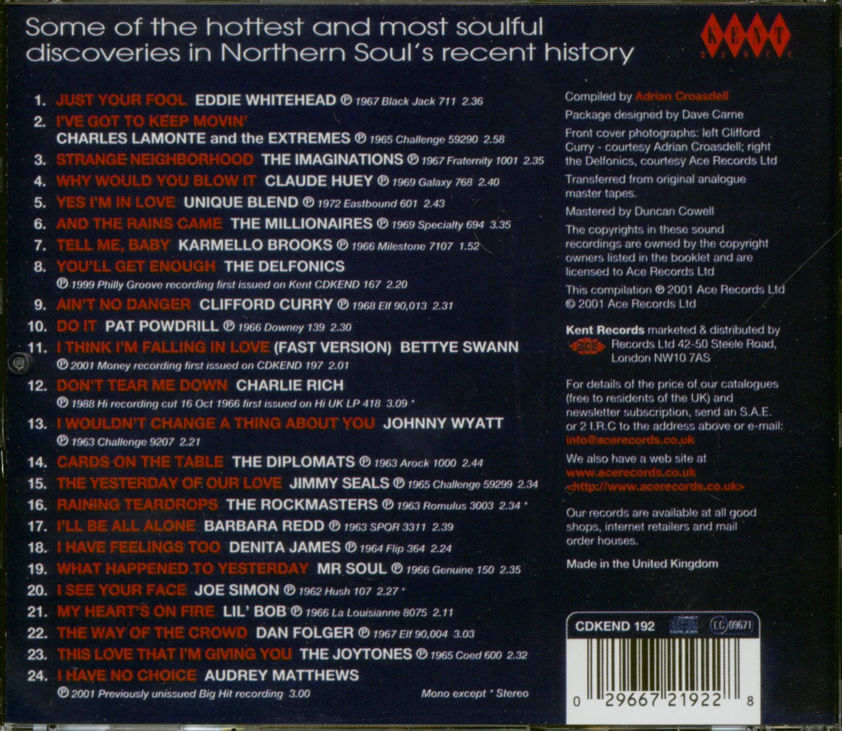 With Northern Soul's Classiest Rarities, ace label Kent, in the shape of the ever-reliable Ady Croasdell, have compiled a scorching selection of 24 mostly recent northern soul discoveries. The inclusion of Audrey Matthews' simply sublime "I have No Choice" is especially timely, as current plays from newly cut acetates have generated a rapturous reception throughout the scene. Elsewhere, Dan Folger's regret-etched beat ballad, "The Way of the Crowd; the legendary cover-up, "What Happened to Yesterday", by Mr Soul; and the Delfonics falsetto festooned, "You'll Get Enough", top many a "wanted list". However, there is one track that makes this compilation absolutely essential--jazz diva Karmello Brooks' potently crooned "Tell Me Baby". Originally issued on jazz label Milestone in 1966, this self-penned fully orchestrated up-tempo slice of soul alchemy was actually the flip-side. --Chris D King