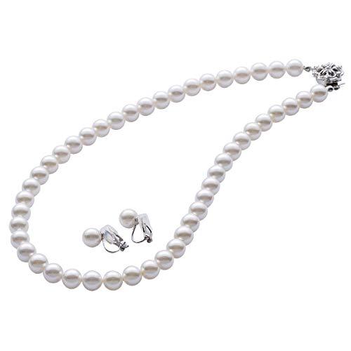 【生産国:日本】 サイズ(約)/ネックレス:45㎝(ゆったりサイズ)、イヤリング:縦1.8×横1.1㎝、真珠:8㎜ 素材/宝石:グランプレミアム貝パール(人工真珠、あこや貝真珠層、天然貝核)、ネックレス留め具:真鍮(ロジウムメッキ)取り外しのしやすい板ばね式です。 イヤリング:長時間の着用でも痛くなりにくいソフトクリップ式です。