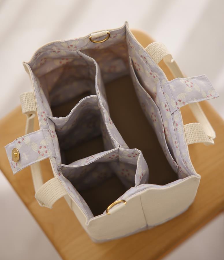 お散歩用の小さいトートバッグです。仕切りが沢山あり、中身がすっきり収納できます。収納箇所は4か所。大きなスペースには長財布、小さなスペースにはペットボトルやハンディファン、サングラスが立てて収納でき、出し入れも簡単!外側に小さなポケットと、内側に大きなポケットもあります。
