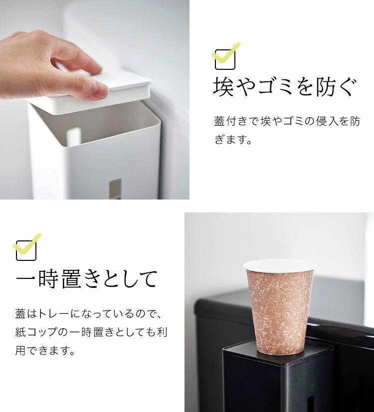 ウォーターサーバーの側面にマグネットで簡単取り付け。直径約5.2~8cmの紙コップ対応のディスペンサー。両側面にスリットが入っているので残量が見え、サーバーの左右どちらにも設置できます。バックル(4つのツメ)を調節して様々なサイズの紙コップに対応可能。マグネットが下部に付いているので、コップが取りやすい高さに取付けが可能。蓋付きでほこりを防ぎます。蓋はトレーになっていて、コップ等の一時置きに便利。付属の木ネジや壁面にも取り付け可能です。