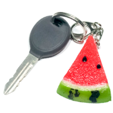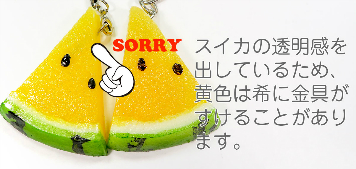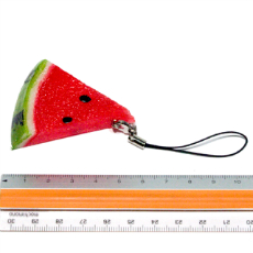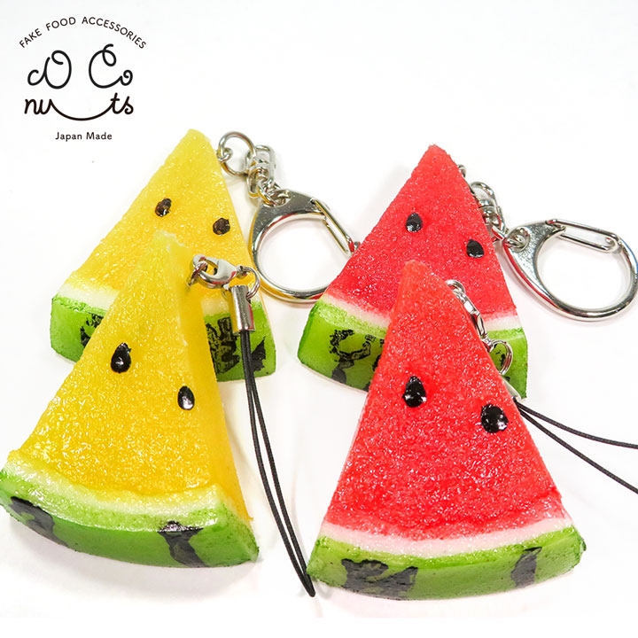 長さ約5cmのミニサイズのカットスイカの食品サンプルアクセサリーです。触ると果汁があふれそうなくらいみずみずしい仕上がりです。赤と黄色の2色があります。