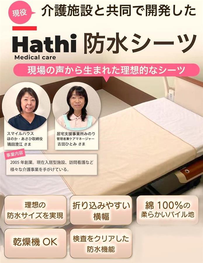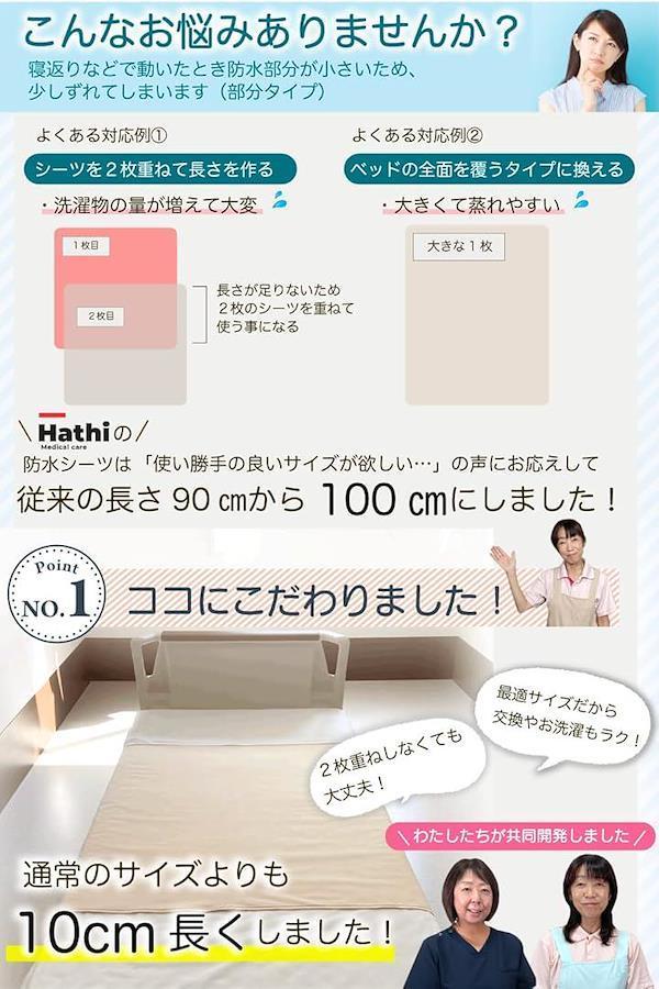 Hathiの防水シーツは従来品と比べて使い勝手の良い100cmのサイズにすることで、 他の防水シーツ(シングル)やおねしょシーツと比べて扱いやすい介護用品をつくりました。