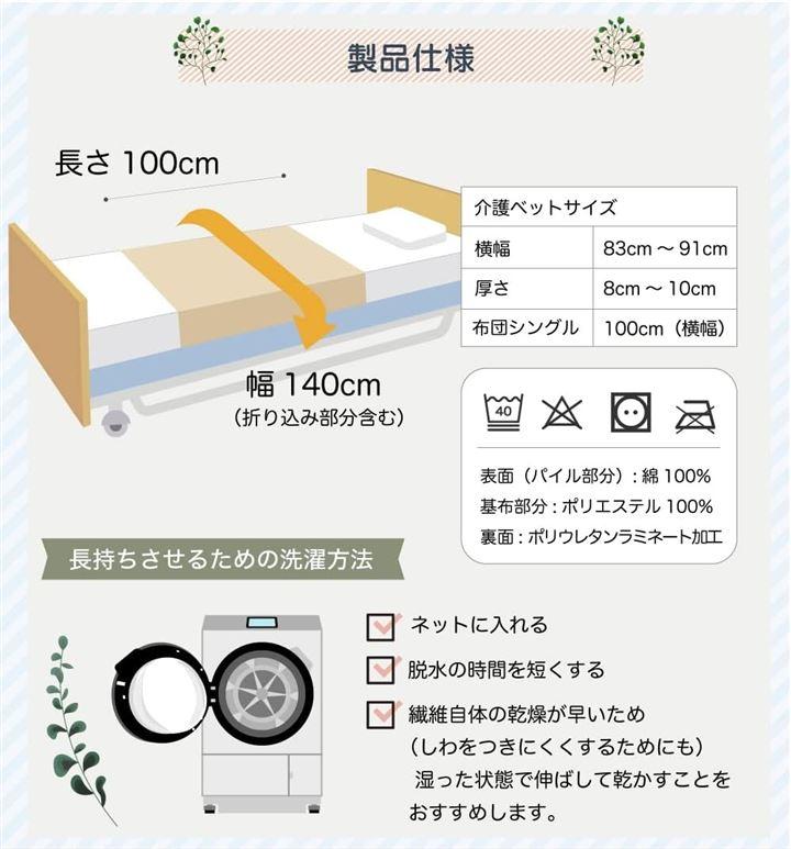 「折り込みやすい横幅&綿100%の柔らかいパイル地」 介護ベッドのサイズを考慮して140cm幅でつくりました。