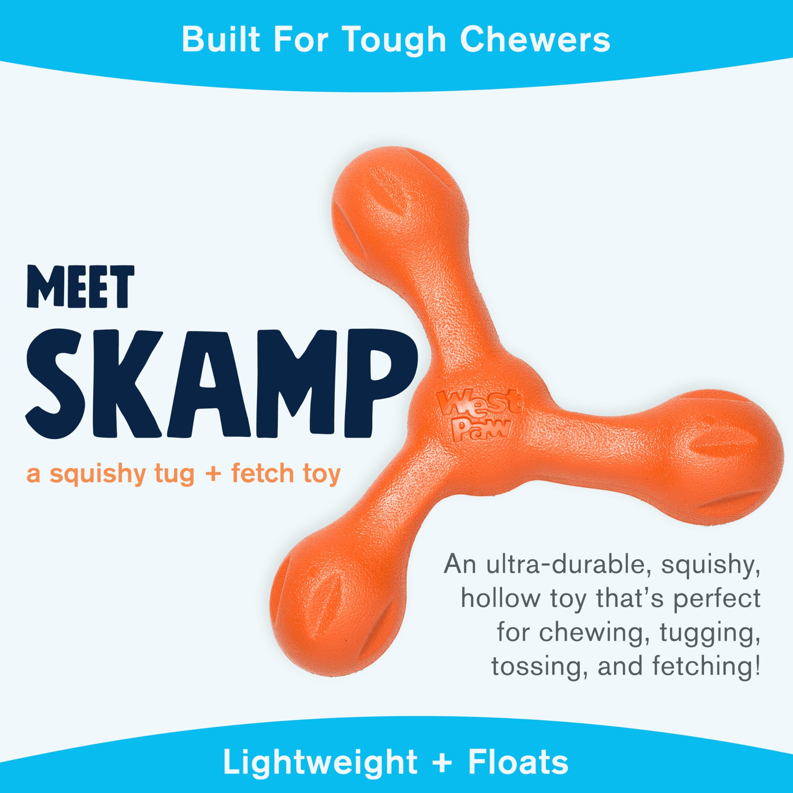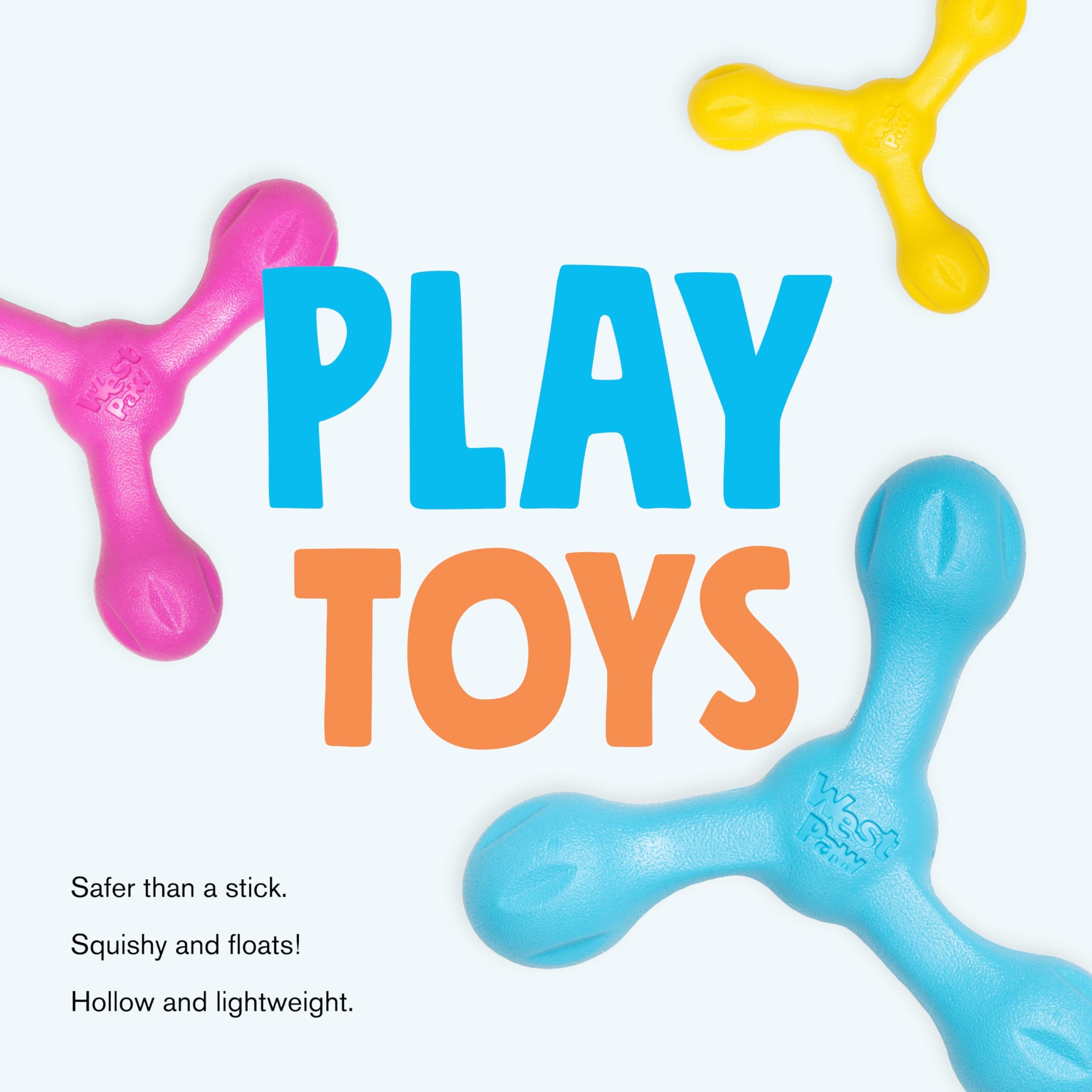 プロペラのような形状で、フェッチ遊びやレトリーブ、引っ張りっこなどいろいろな遊び方ができます。三方向で引っ張りっこができるので、2頭のワンちゃんと同時に遊ぶなんてこともできます!アメリカのウェスト・ポウ社が独自に開発した素材「ゾゴフレックス」で作られており、丈夫なのが自慢。木の枝のように折れたり裂けたりせず、ワンちゃんの口の中も傷つきません。弾力性が高く、ワンちゃんにとって楽しい噛み心地。中が空洞なので軽くてやわらかく、パピーやシニア犬などの噛む力が弱いワンちゃんにもおすすめです。水に浮くので、川、海、プールなど水場でも遊べます。汚れたら水洗いできます(食洗機も利用可能)BPAフリー、フタル酸フリー、ラテックスフリーだからワンちゃんに安全。リサイクルも可能で、環境にも優しいおもちゃです。サイズ:幅22cm × 高さ22cm × 厚み5cm、重さ190g