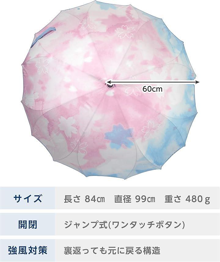 [耐風] いつも風で骨が折れてしまう...という方に ・メインの骨がすべて釣り竿のようにしなるグラスファイバー製 ・メインの骨がグラスファイバー製だからさびにくくて劣化しにくい ・通常の倍の16本も骨がある ・お花のような形の特殊な組み方をしている 「風でひっくり返ってしまっても一瞬で戻せるくらい」とっても丈夫なんです。 [使いやすさ] ・石突きの先端は滑りにくいラバー製 ・ヒラヒラしない止めベルト、自然に本体に付くよう考えた面ファスナー付 ・ニットにひっかっからない。すっきりとしたジャンプボタン [一枚張り(シームレス)] ・縫い目のない一枚張りの生地 ・まるで絵画のようなイラストを全面に表現 ・縫い目からの雨漏りリスクを軽減 通常の婦人傘では小さく感じるけど紳士傘を持つのはちょっと違う...という方に ・16本の骨があることで、生地面積が広くなるから同じ大きさでも差したときだけちょっと大きめ ・メインの骨がグラスファイバー製だから鉄製の骨よりもちょっと軽量 ・紳士傘と違って華やかなデザインが豊富 [スペック] *素 材 生地:ポリエステル100%/骨:グラスファイバー *サイズ 親骨の長さ:60cm *全長総丈の長さ:84cm *重さ重さ:480g 「ご注意」 *撥水性の高い柔らかい生地の特性上、通常の傘よりシワが見受けられる場合がございます。