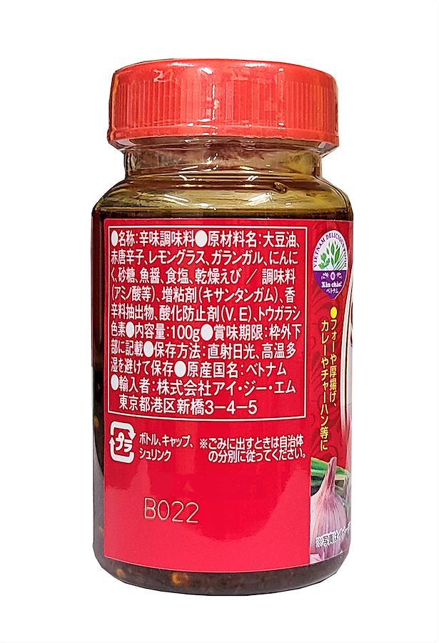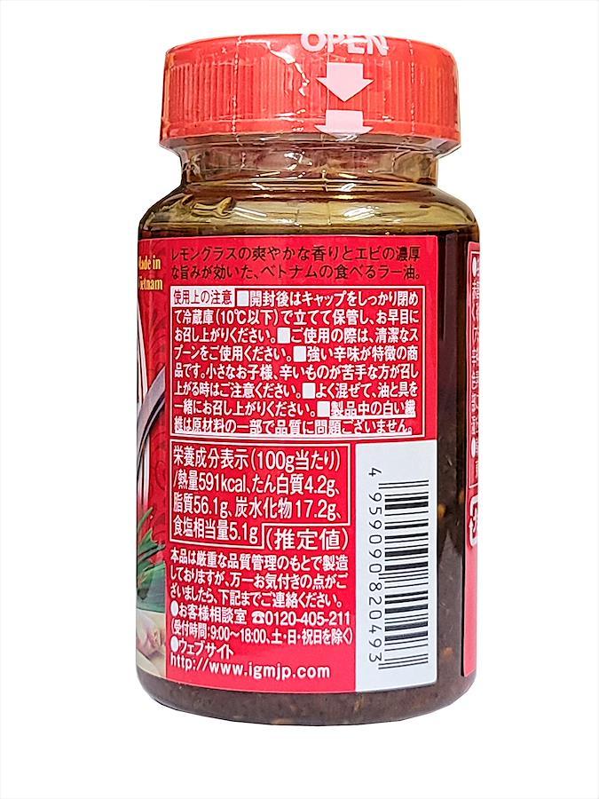 大豆油、赤唐辛子、レモングラス、ガランガル、にんにく、砂糖、魚醤、食塩、乾燥えび/調味料(アミノ酸)、増粘剤(キサンタンガム)、香辛料抽出物、酸化防止剤(V.E)、トウガラシ色素