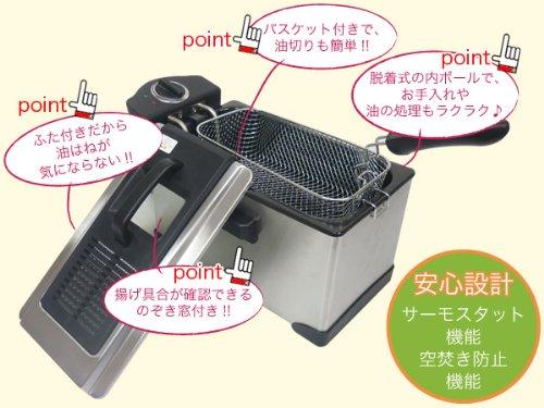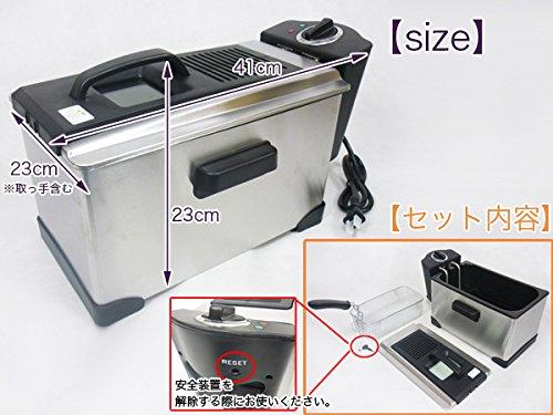 3営業日以内に発送≪新品未開封品≫:サイズ(約):幅41×奥行き23(取っ手含む)×高さ23cm バスケット内寸:24×14×8cm重量:約2.56kg 定格電圧:100V 50/60Hz 消費電力:1300W容量:3.5L 油温度調節範囲:130~190度材質:ステンレス コードの長さ:約100cm中国製 良品返品不可