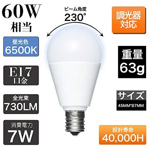 一年保証:本製品は購入日より1年保証付きです。もし問題がある場合はお気軽にご連絡ください。長寿命:長寿命約40,000時間で、1日10時間のご使用でも約10年以上取替不要、お金と手間を節約します。省エネ:口金E17 60W形相当、定格電力7Wのみ、一般白熱電球に比べて90%の電気代を省くことができます。環境保護:水銀なし、紫外線なし、環境に優しいです。PC、アルミニウムの材質なので軽くて壊れにくくなり、地震にも安心できます。使用範囲: 密閉器具に対応できます。キッチン、リビングルーム、ベッドルーム、廊下の卓上ランプとフロアランプ、またはペンダント器具や天井器具などに使用可能です。