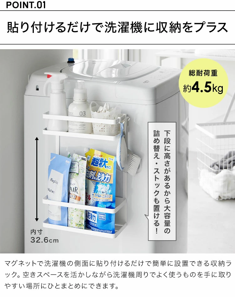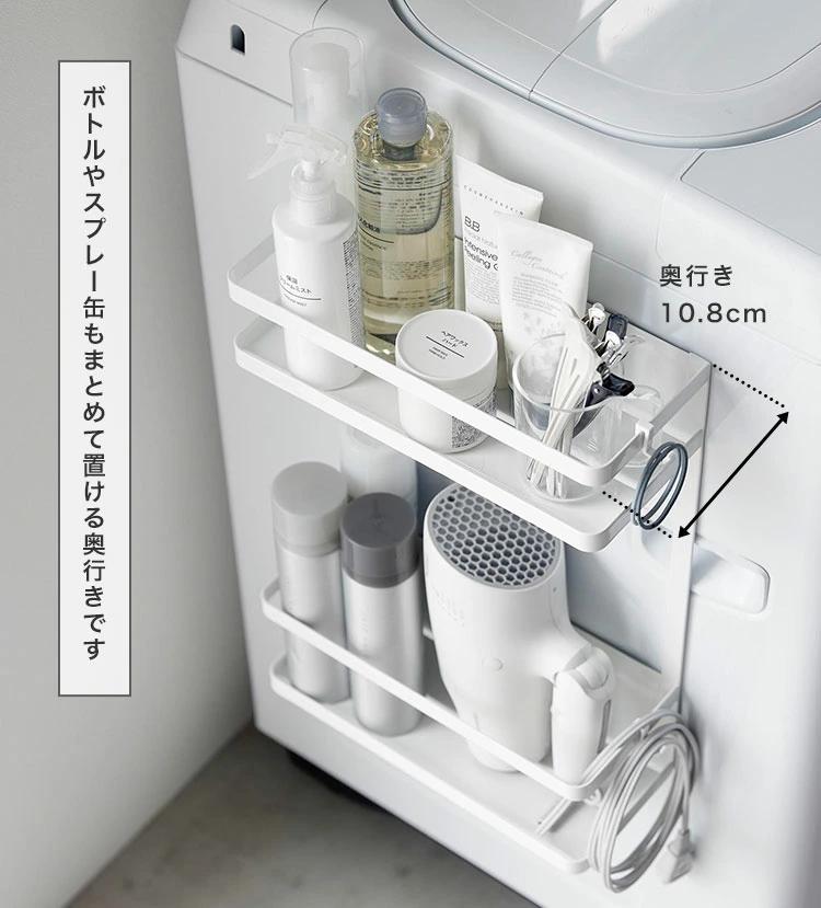 【洗濯機横マグネット収納ラック 2段】マグネットで洗濯機の側面に簡単に設置できる収納ラック。強力な磁力で最大4.5kgの耐荷重性があり、下段には大容量の洗剤の詰め替えやストックも置くことができて便利です。洗剤の他にも化粧品やドライヤーの収納にも便利。掃除道具などを引っ掛けておけるフックも2つ付属しています。