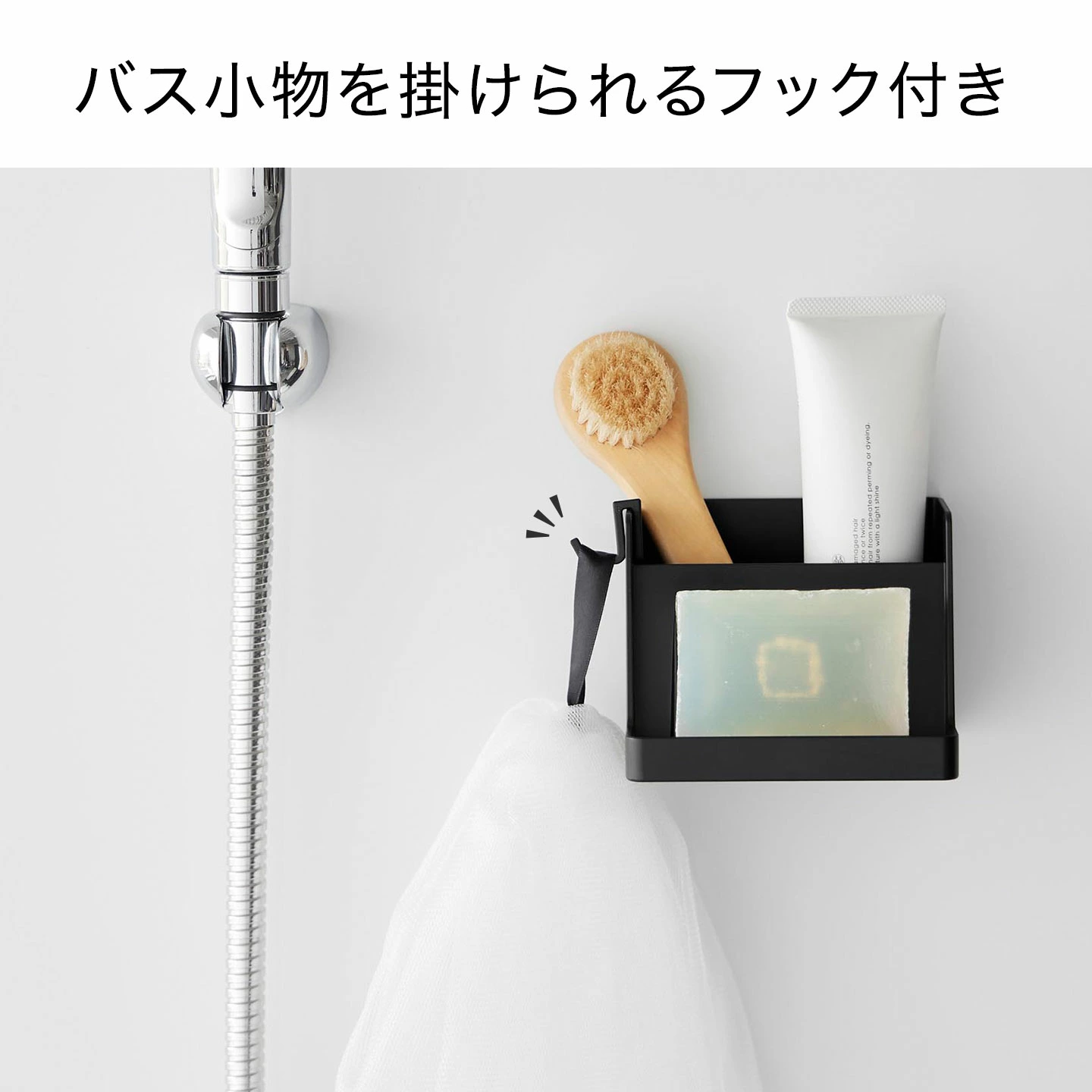 マグネットで浮かせて設置できるソープトレーです。石けんと洗面小物をひとまとめに収納できます。洗濯用石けんと洗濯ブラシセットの収納にもおすすめ!バス小物も掛けられる便利なフック付きで、底面には水抜き穴があるため水はけが良く、乾きやすい設計です。マグネットでの取り付けだけでなく、置き型としても使用できます。