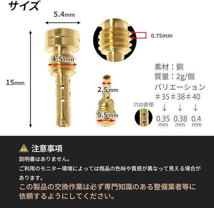 ケイヒンやミクニなどのメインジェットとスロージェットを含む、バイク用パイロットジェット#35、#38、#40(穴のサイズがそれぞれ0.35mm、0.38mm、0.40mm)をご用意しています 購入前にお使いのキャブレターが適合するバイク用品かどうかをご確認ください