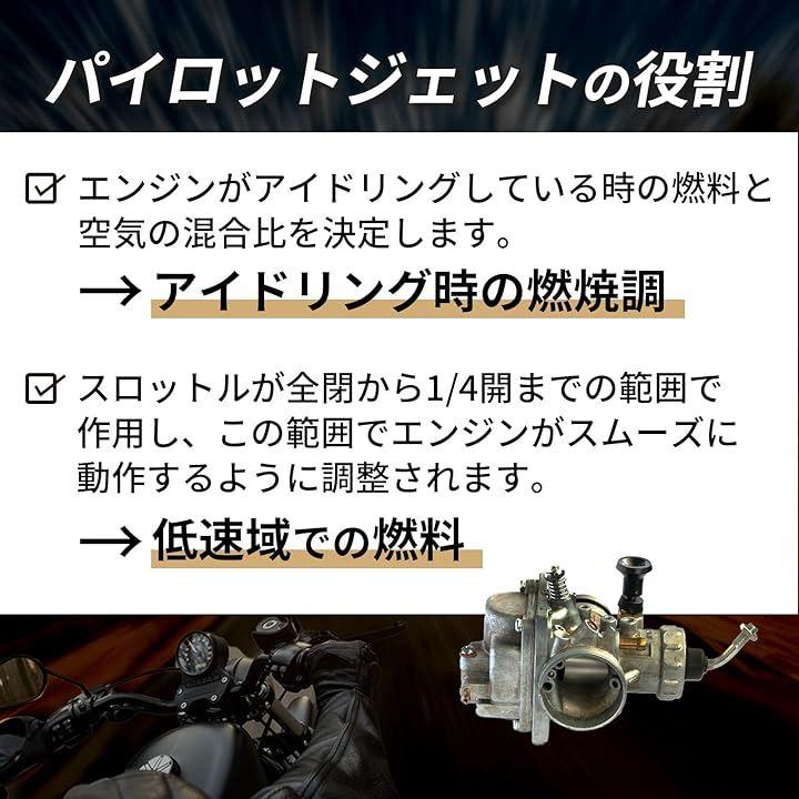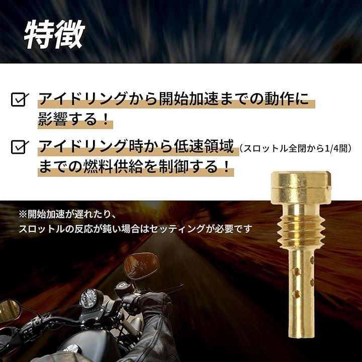 アイドリングから開始加速までの動作に影響するパイロットジェットです 開始加速が遅れたり、スロットルの反応が鈍い場合はセッティングが必要です