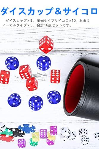 ?【パッケージ内容】ダイスカップ×1、ダイス蛍光タイプ×10、おまけノーマルタイプ×5、合計16点セットです。 ?【サイズ】ダイスカップ約9.1×8.2cm、素材:PUレザー・プラスチックです。蛍光タイプのサイコロ赤と青は約1.6×1.6cm、素材:高品質なカラフル アクリルを採用されています。 ?【ダイスカップ】高級感のある合皮素材を丁寧に手縫いで仕上げたステッチ、内側はソフトベロアのフェルトライ二ングなので音を減らし、厚いカップ壁はさらに音の伝播を妨げ、ゲームをより良く楽しむことができます。 ?【便利性】円柱形設計のカップでユーザーの手触り、サイズ感、握り心地は抜群です。そしてカップとサイコロのセットだから、すぐに本格的なダイスゲーム、ダイススタッキングが楽しめます。 ?【多用途】家庭用、ホテル、KTV、カジノ、バックギャモン、ボードゲーム、マジックなどの各種ゲーム用に使えるし、バー、飲み会、パーティー、合コン、旅行などにも持って行けます。