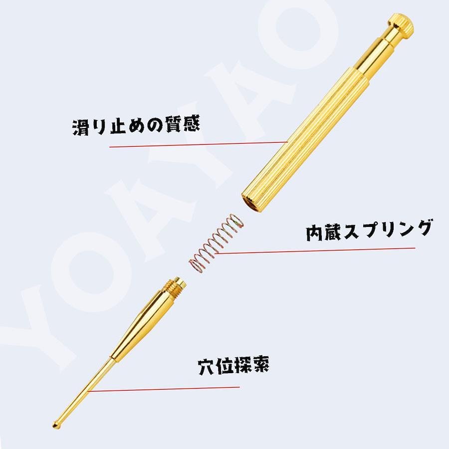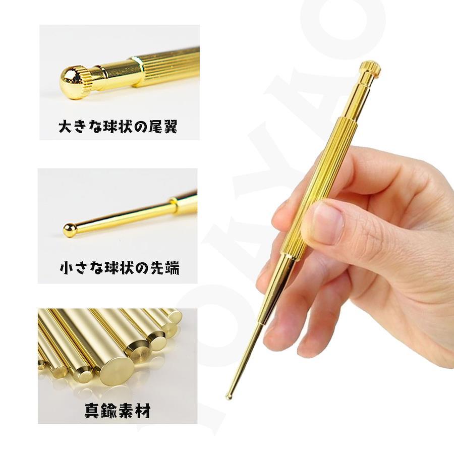 【耳つぼを刺激して、いい感じ!】ツボ押し棒としても、耳ツボを押すときにも最適なアイテムです。ツボは耳に約91か所あり筋肉、神経、内臓などと連携しています。マ押すだけで表情筋のコリをほぐすポインター。お顔のケアだけでなく、耳つぼや全身などにもお使いいただけます。 【バネ内臓で圧を調節できる】スティックには、バネが内臓されており、つぼ押しの圧を調節できます。初めてのご購入にもおすすめとなっております。ばね式なので、あなたの耳ツボをやさしく刺激してくれます。YOAYAOのツボ押し棒は、丸い先端と握りやすい形状で効果的にツボを刺激できます。 【真鍮製】銅製。黄銅製の耳穴探穴ペンは、耐久性があり、優れた品質の材料で作られています。安定性があり、長期間にわたって使用できます。表情筋を弛緩させ、血流を促すことで、リフトアップや美肌が期待できます。 【快適な操作性】握りやすいデザインと正確な操作感が、穴位探索の正確性と快適性を確保します。先端は細いですが、球状に仕上げているため、痛みを軽減してくれます。細かい部分への施術が可能です。肩こり解消やダイエットなどの健康&美容効果も期待できる耳つぼマッサージ! 【持ち運び便利】コンパクトなサイズと軽量設計で、ツボ押し棒は持ち運びに便利です。プロのセラピストや個人の健康管理において、いつでもどこでも使用できます。マッサージ ストレス解消グッズ 自宅でも楽に使える!※過度な刺激はあざとなりますのでお気をつけください。