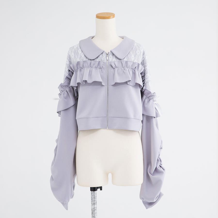ガーリー×スポーティーが旬なブルゾンのご紹介♪【デザイン】たっぷりのフリルとヨークレースが目を惹くブルゾンです。フロントファスナーを開けて羽織れる仕様です。フリルは後ろ身頃までつけたので、後ろ姿まで抜かりなく可愛いデザイン◎お袖にちょこんと付けたリボンがアクセントに!襟元は丸みのある角襟にして、ガーリーさをプラスしました。お袖はギャザーをたっぷり寄せてボリューム感を出した、あざとくてイマドキなデザイン♪長すぎず短すぎない着丈にしたので、スタイルUP効果も抜群です!