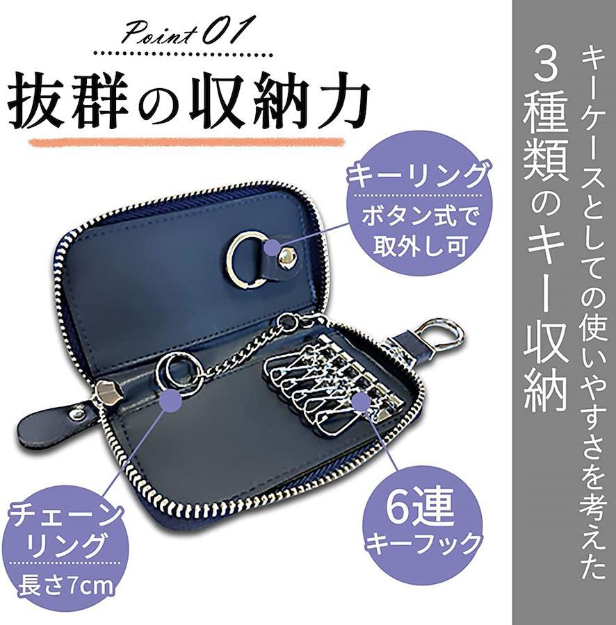 登録情報クロージャータイプ ファスナー 【素材】レザー:耐久性に優れたスプリットレザーを使用。ファスナーは高品質の合金を使用。なめらかな滑りでカギの出し入れにストレスを感じさせません。【カラー】全15色 ブラック、ブラウン、ダークブラウン、ネイビー、スカイブルー、ピスタチオグリーン、イエロー、レッド、ローズ、ピンク、ラベンダーミスト、ピンクベージュ、ブラック(格子柄)、ブルー(格子柄)、ブラウン(格子柄)【仕様】サイズ:縦11cm×横6cm×マチ2.5cm (カラビナ含まず)、チェーンリング:7cm、重さ:98g【抜群の収納力】①6連キーフック、②脱着可能なキーリング、③チェーン付きキーリング。通常の鍵はもちろん、スマートキーも収容可能。【カードポケット】内側にカードポケットが2つあります。カードキー、交通系カード、クレジットカード、免許証、お札を一緒に持ち運べるのでとっても便利。ちょっとしたお出かけはこれひとつで。