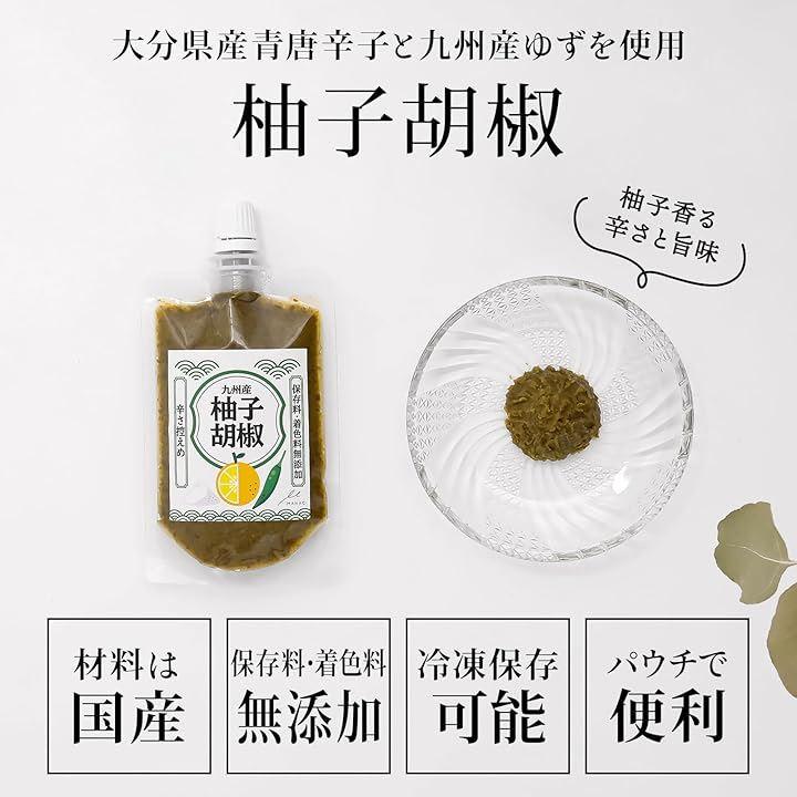 九州産のゆず、長崎県産の塩、大分県産の唐辛子だけを使用した、保存料着色料無添加の柚子胡椒です。