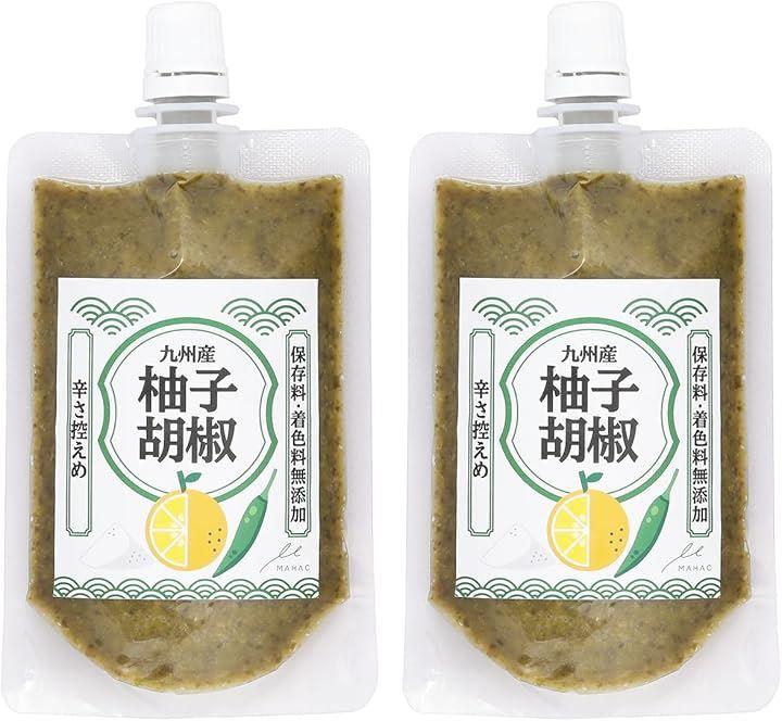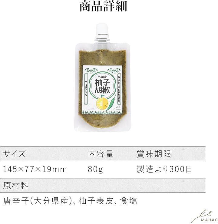名称:柚子こしょう原材料:唐辛子(大分県産)、柚子表皮(九州産)、食塩(長崎県産)内容量:80 g賞味期限:パッケージに記載保存方法:直射日光を避けて常温にて保存販売者:MAHAC(マトバカナモノ有限会社)大阪府大阪市中央区平野町2-1-14製造所:(有)大分千歳村農産加工大分県豊後大野市千歳町高畑50番地栄養成分表示:100gあたりエネルギー 58kcalたんぱく質 1.5g脂質 0.7g炭水化物 11.3g食塩相当量 17.2g