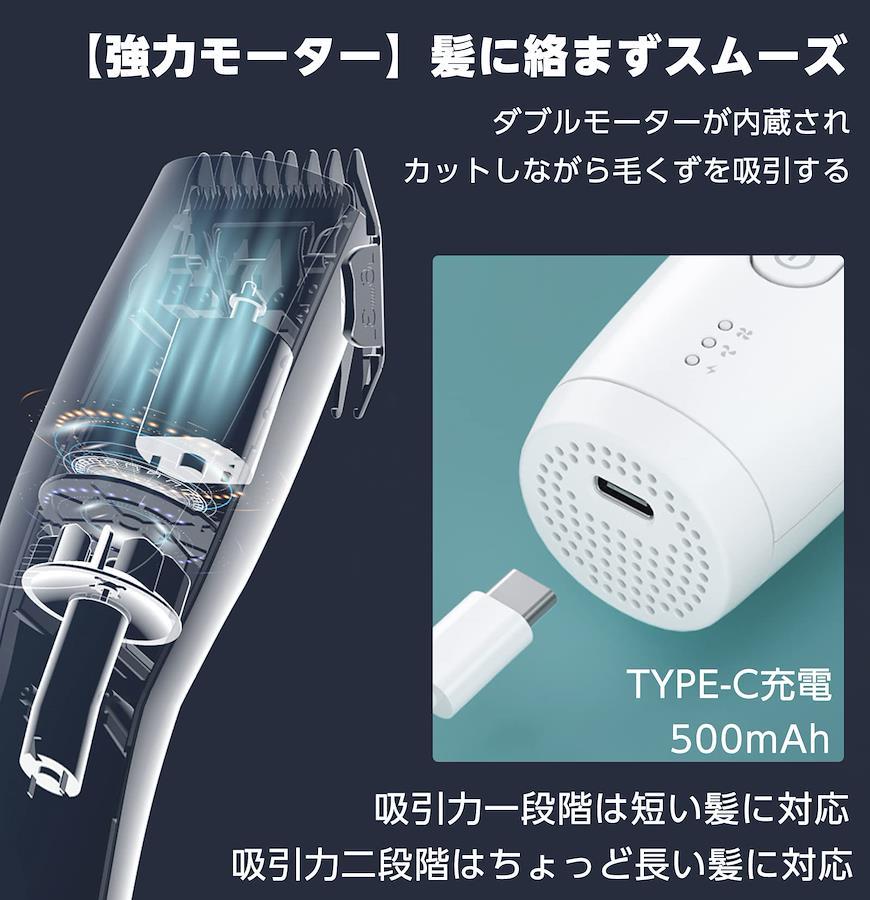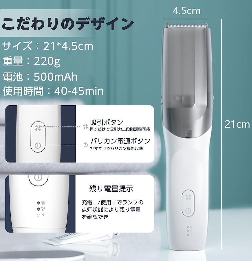 3営業日以内に発送≪新品未開封品≫:【最新進化版】【刈る+吸い取る】良質なステンレススチールとセラミックで構成された刃と優れたなR面取り刃設計で、肝心の切れ味が良く、肌を傷つけることもなく、いつでも安心かつ快適にヘアーカットてきます。髪の毛を吸い取りながらカットするからゴミを気にしなくていい充電式のバリカンです。震動の頻度が高い、切れ味は抜群、綺麗な仕上がりに!/【吸引力二段階調整+刈り高さ調整可能】強力モーターを採用され、吸引力を強化して、二段階調整もできました。刈り上げ、ツーブロック、丸刈りなど、均等な長さにカットできます。 0mm/3mm/6mm/9mm/12mmの長さにカットできるアタッチメントが3種類付属しています。坊主頭やツーブロックの方など、自宅で髪の長さを揃えるだけなら充電式バリカンが便利です!お子様のカットにもご利用いただけます。/【USB充電式+残り電量表示】本製品は500mAhのバッテリーを内蔵しています。充電式なので、洗面所でもお庭でもどこでも使う事ができます。 フル充電状態で約45分間連続使用ができるので、しっかり残さずカットできます!LEDランプ付き、電量残量を一目で分かります。