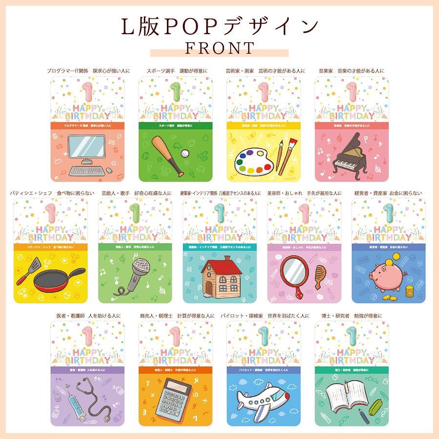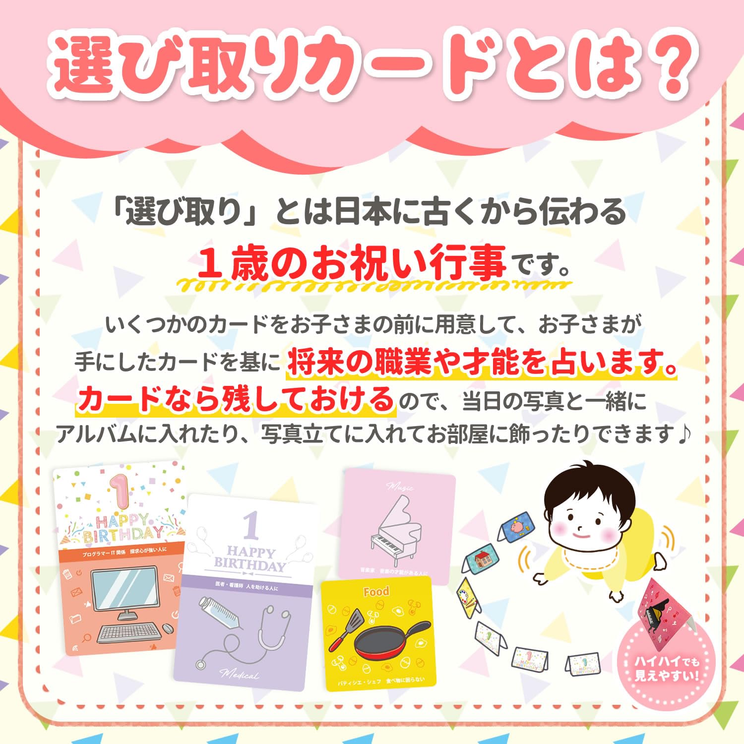 ?【選び取りカードとは?】 「選び取り」とは日本に古くから伝わる1歳のお祝い行事です。 いくつかのカードをお子さまの前に用意して、 お子さまが手にしたカードを基に将来の職業や才能を占います。 カードなら残しておけるので、当日の写真と一緒にアルバムに入れたり、 写真立てに入れてお部屋に飾ったりできます♪ ?【選べる4種類のバリエーション】 サイズは写真と同じL版と正方形からお選びいただけます。 それぞれPOPデザインとナチュラルデザインを用意しました。 お好みのカラーに合わせてお選びください♪ ?【L版サイズ】 L版サイズはハイハイ時期の赤ちゃんにも見えやすいように、2つ折りで立てられます。 選んだカードを思い出として当日の写真と一緒にアルバムに入れたり、写真立てに飾ったり出来るサイズです。 89mm×127mm 厚さ0.4mm(厚めのハガキ程度) ?【正方形サイズ】 正方形サイズは裏面が「HAPPY BIRTHDAY」の文字になっております。 記念写真を撮影する際の飾りとしてお使いください♪ 89mm×89mm 厚さ0.4mm(厚めのハガキ程度) ?【バラエティに富んだ13枚セット】 カードは13枚入りとなっており、13種類のイラストをご用意しました。 赤ちゃんの目に留まりやすいイラストとなるように現役の保育士さんと一緒にデザインしました。 カードは赤ちゃんが触っても安心できるよう4つ角を丸くした形状です。 ?【日本人スタッフによる品質保証・安心のサポート体制】 商品は日本人スタッフにて1つ1つ検品しておりますが、万が一初期不良などがあった場合は、 弊社サポートにお問い合わせいただきましたら、 24時間以内に必ず対応させていただきます。 ?【L版】89mm×127mm 厚さ0.4mm 【正方形】85mm×85mm 厚さ0.4mm 【各13枚セット 】【素材 紙 日本製】