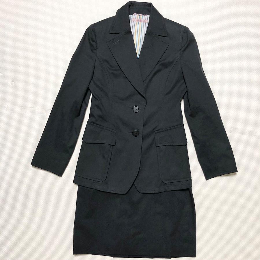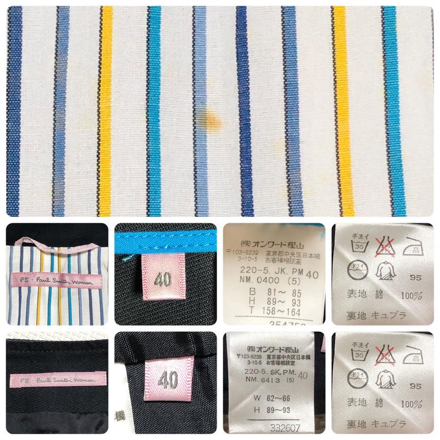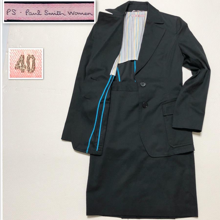 ■商品概要PS Paul Smith ピーエスポールスミススカートスーツ 上下セットアップsize40(サイズL相当) ※詳細は下部寸法値を必ずご確認くださいブラック×裏地マルチストライプオンワード樫山コットンジャケット シングル2つボタンスカート ひざ丈タイト スリット春夏秋服 背抜きビジネス フォーマル ママスーツ 参観日 入学式 卒業式 冠婚葬祭レディース