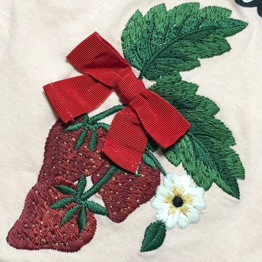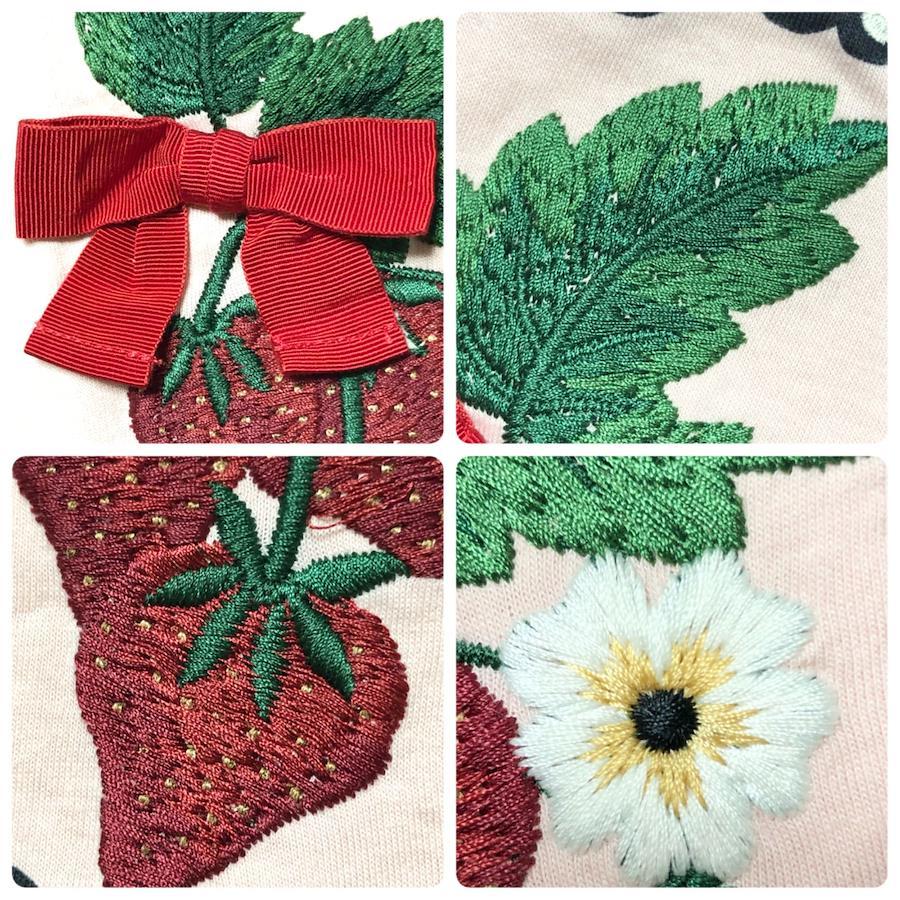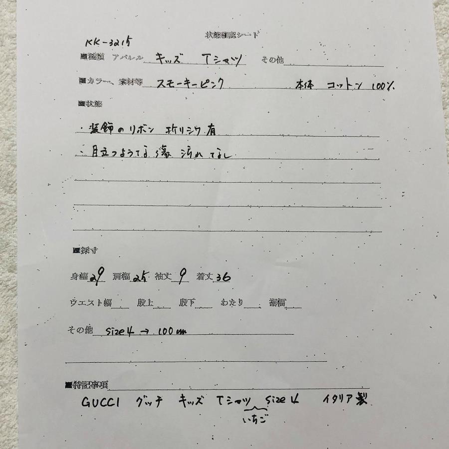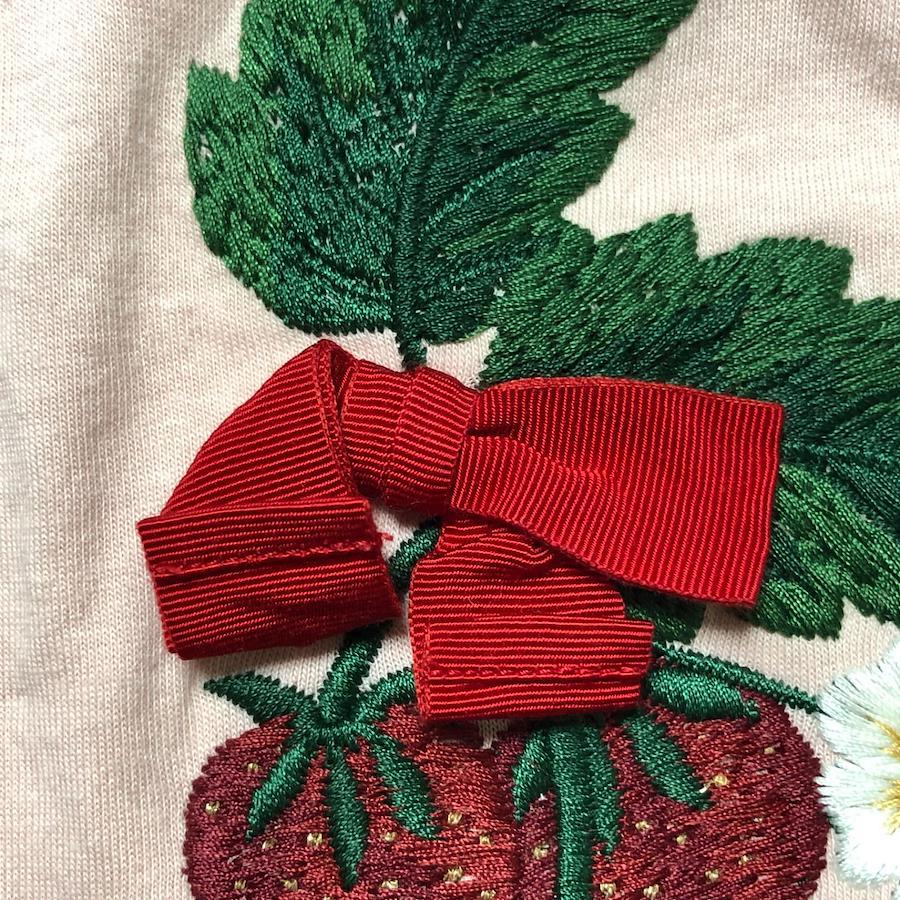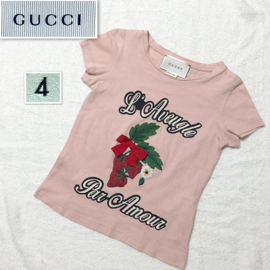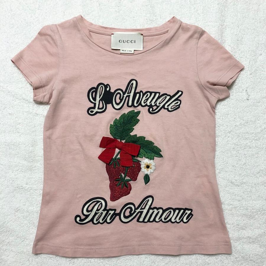 ■商品概要GUCCI グッチTシャツ 半袖キッズいちご 刺しゅう リボンsize4(100cm) ※詳細は下部寸法値を必ずご確認くださいイタリア製スモーキーピンクコットン100%女児 女の子 子供服ラグジュアリー 高級 ハイブランド おしゃれ