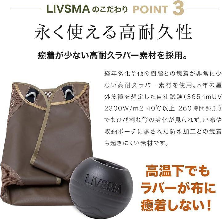 5年の屋外放置を想定した自社試験(365nmUV 2300W/m2 40℃以上 260時間照射)でもひび割れ等の劣化が見られず、座布や収納ポーチに施された防水加工との癒着も起きくい素材です。