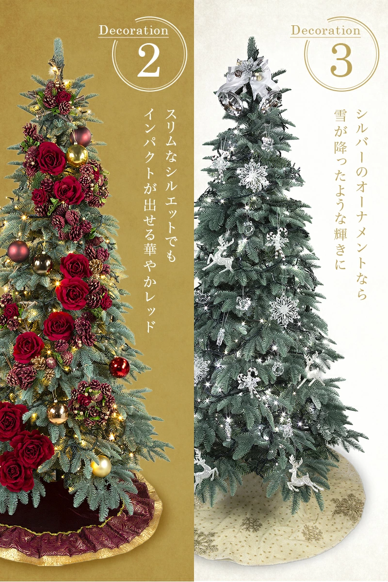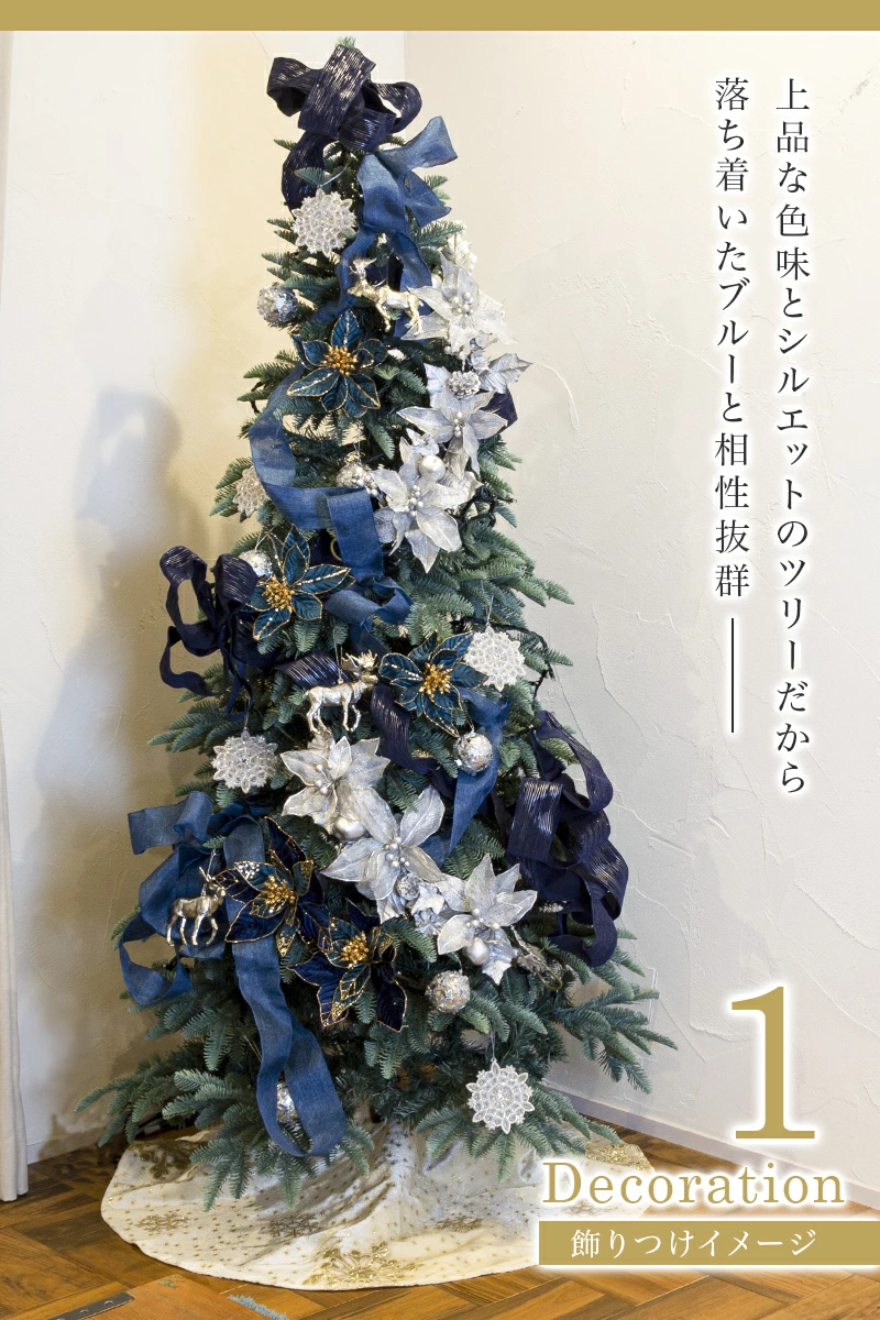 多くのクリスマスが大好きなお客様より『ブルー・スプルース、ホプシーのような人工クリスマスツリーが欲しい』というご要望が寄せられておりました。つまり、葉先がフィルム葉ではなく、もっと本物っぽいもので、色は青銀色で・・・なかなか難しいご要望でしたが、数年かけて発売にこぎつけました。まずは、葉先の詳細写真をご覧ください。本物のような肉厚の葉が密集しております。また、ポリ成型の葉ですので、柔らかく弾力があり、リアルで安全。オーナメントとの調和とクリスマスらしさの観点から実際のブルー・スプルースよりも青みを押さえ、緑を若干濃くしています。全体のフォルムはきれいな前下がりのヨーロピアンスタイルで、落ち着いた上品さを演出しています。発売と同時に大変な反響を呼ぶとともに、スリム化を実現し、日本のあらゆるご家庭で飾りやすいサイズをご用意しました。スリム系ツリーですが、単に細くしたのではありません。北欧などの寒い地方の木々は遠目に見れば縦長のフォルムをしているものが多く存在しています。おそらくそれが北欧らしい景色をイメージする一因なのでしょう。その遠目に見た樹木のフォルムに特長であるトップから裾まで弧を描くように広がり足元まで枝が張っている様子をうまく組み合わせて、北欧の風景の一部みたいに美しいツリーを完成させました。