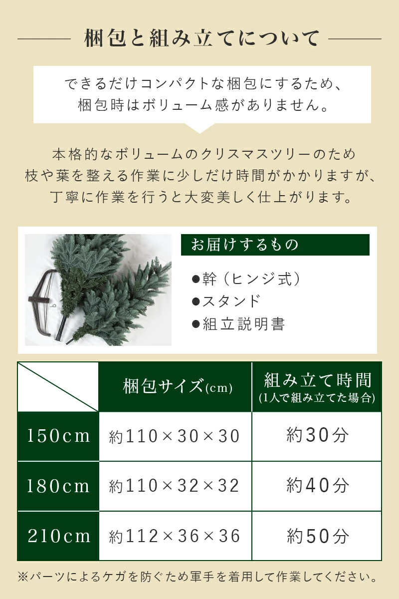 ●高さ:約150cm●枝を広げたときの最大横幅:約88cm●総重量:約5.5Kg●幹は2分割+スタンド●梱包箱のサイズ:110cmx30cmx30cm●組立作業時間の目安(1人で作業した場合)組立+枝を広げる作業:約30分