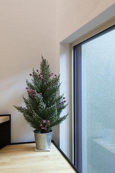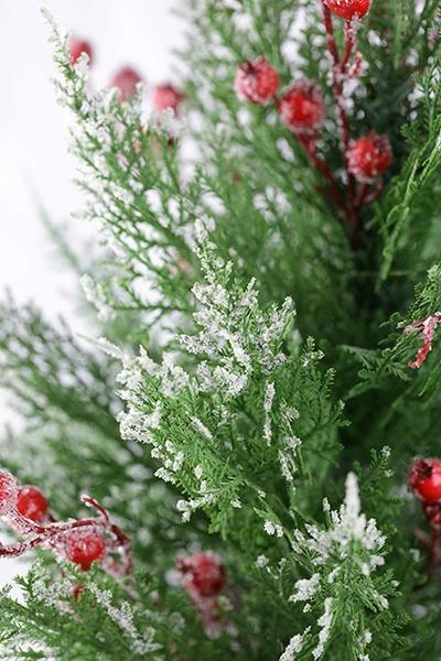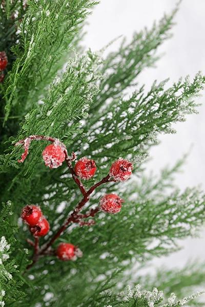 少しトーンを抑えて色々なシーンに合わせやすくしたコニファーに赤い実をさし色に使った可愛いミニツリーです。表面には凍った霜のような小さな氷の粒を付けましたのでクリスマスシーズンの到来を感じます。フワッとしたフォルムと赤い実がそのまま飾っても十分可愛いツリーです。