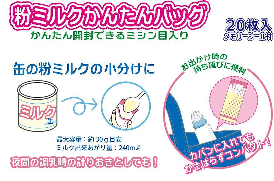 【特長】缶の粉ミルクを必要な分量に小分けできるので、持ち運びに便利です。使い捨てタイプなので、衛生的で手軽に使えます。密封はくるくる巻いてシールでとめるだけで、余分な空気も簡単に抜けます。ミシン目入りなので、かんたんに開封できて、哺乳びんに注ぎやすいです。粉ミルクのさじ数と出来あがり量等が書けるメモリーシール付で便利です。*メモリーシールは指定のところに必ず貼ってください。