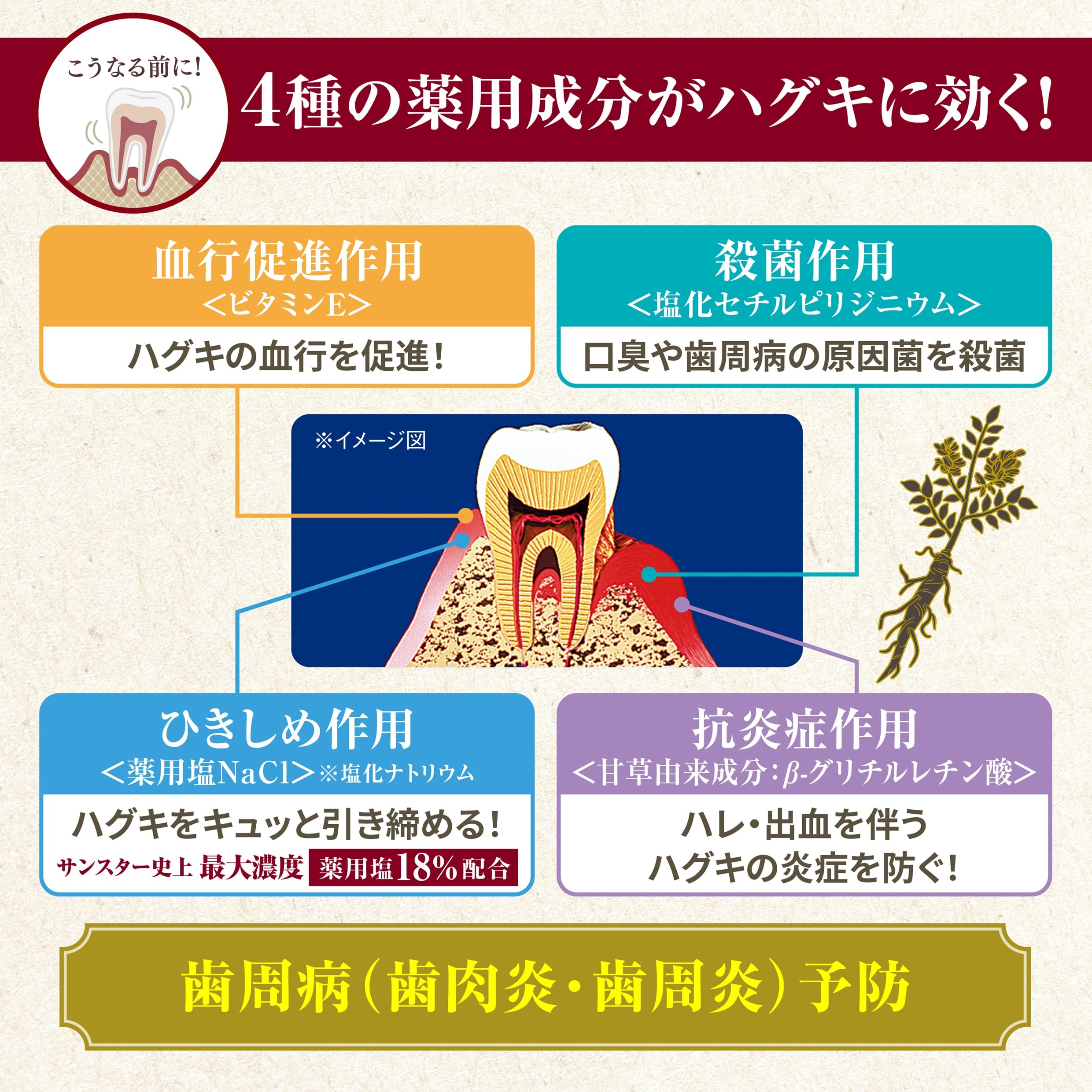 〇商品説明4種の薬用成分を配合。口臭・ネバつきを伴う歯肉炎・歯周炎を防ぐ。甘草由来成分配合でハレ・出血を伴う、ハグキの炎症を防ぐ/塩化セチルピリジニウムで口臭や歯周病の原因菌を殺菌/薬用塩NaClがハグキをキュッと引き締める/ビタミンEがハグキの血行を促進。[後味すっきりな爽快感のある、すっきりハーブタイプ]